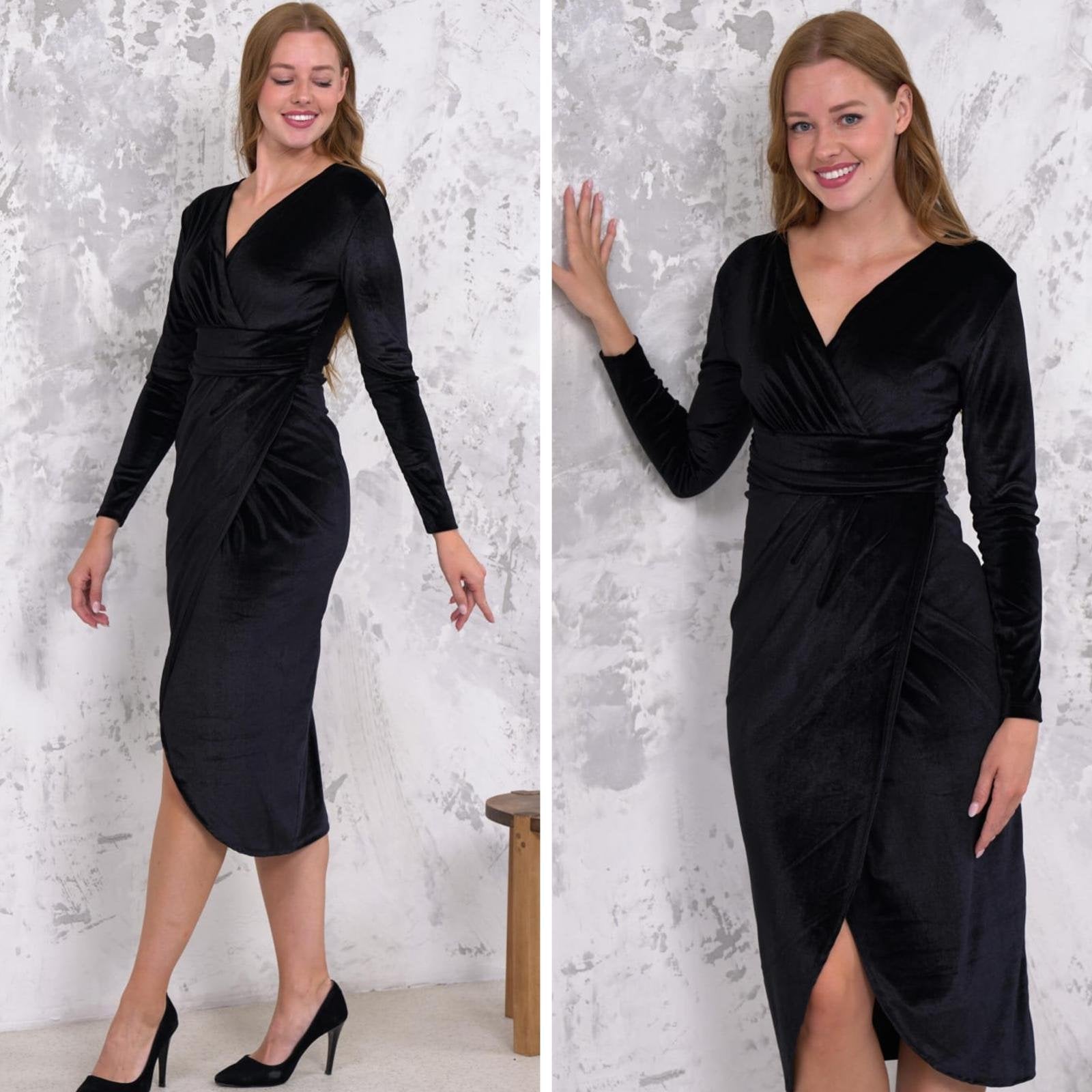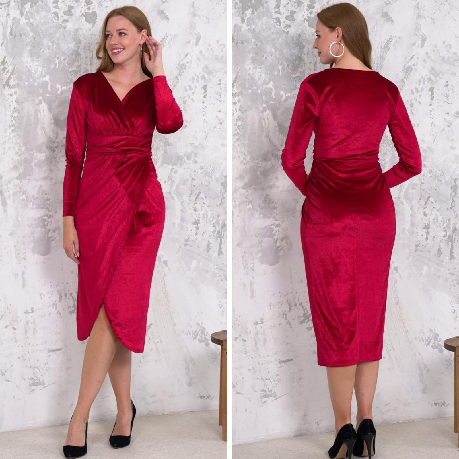 Kadın Kadife Kumaş V Yaka Uzun Kollu Midi Boy Elbise