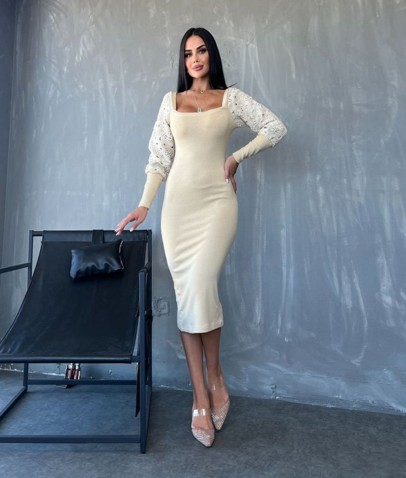 Kadın Kare Yaka Kolları Manşet Ve Tül Detay Fırsat ürün Midi Boy Elbise