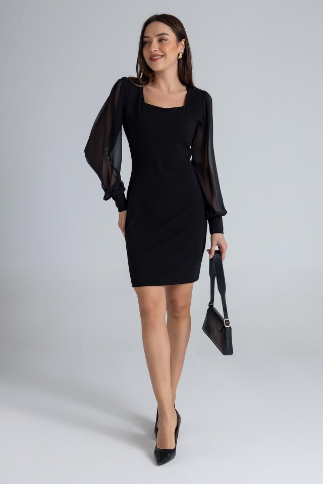 Kadın Kare Yaka Kolları Tül Sandy Kumaş Fırsat ürün Mini Siyah Elbise