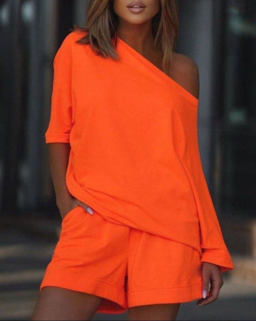 Kadın Kayık Yaka Salaş Iki Iplik Bluz Ve şort Ikili Takım