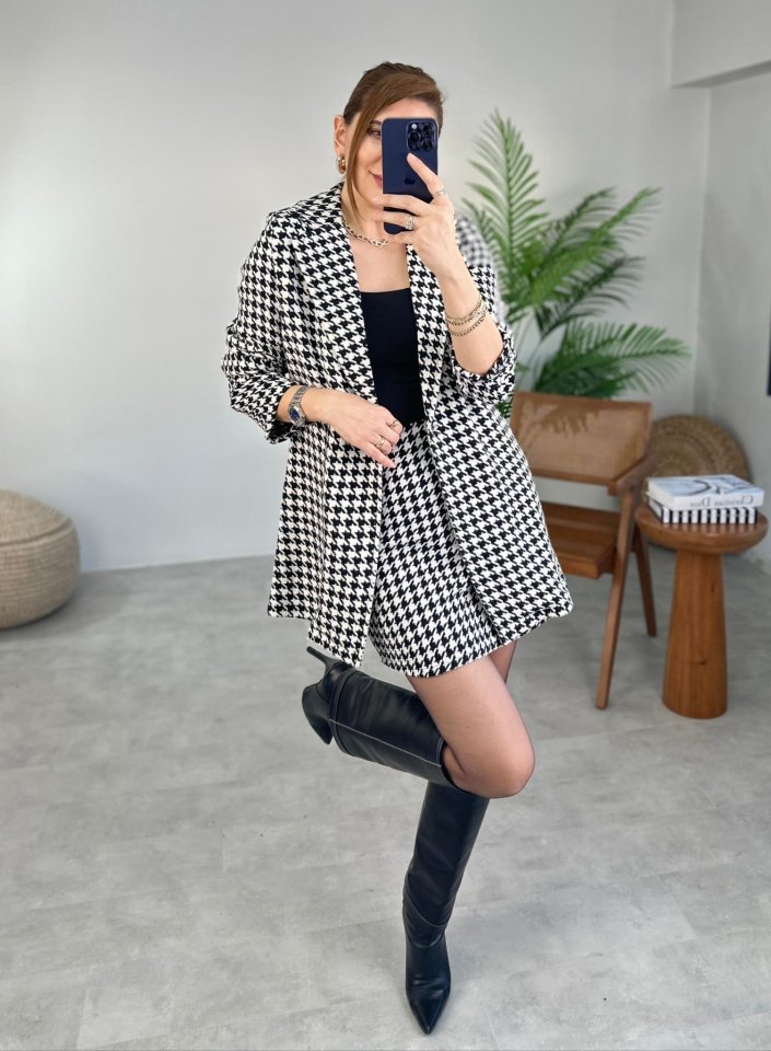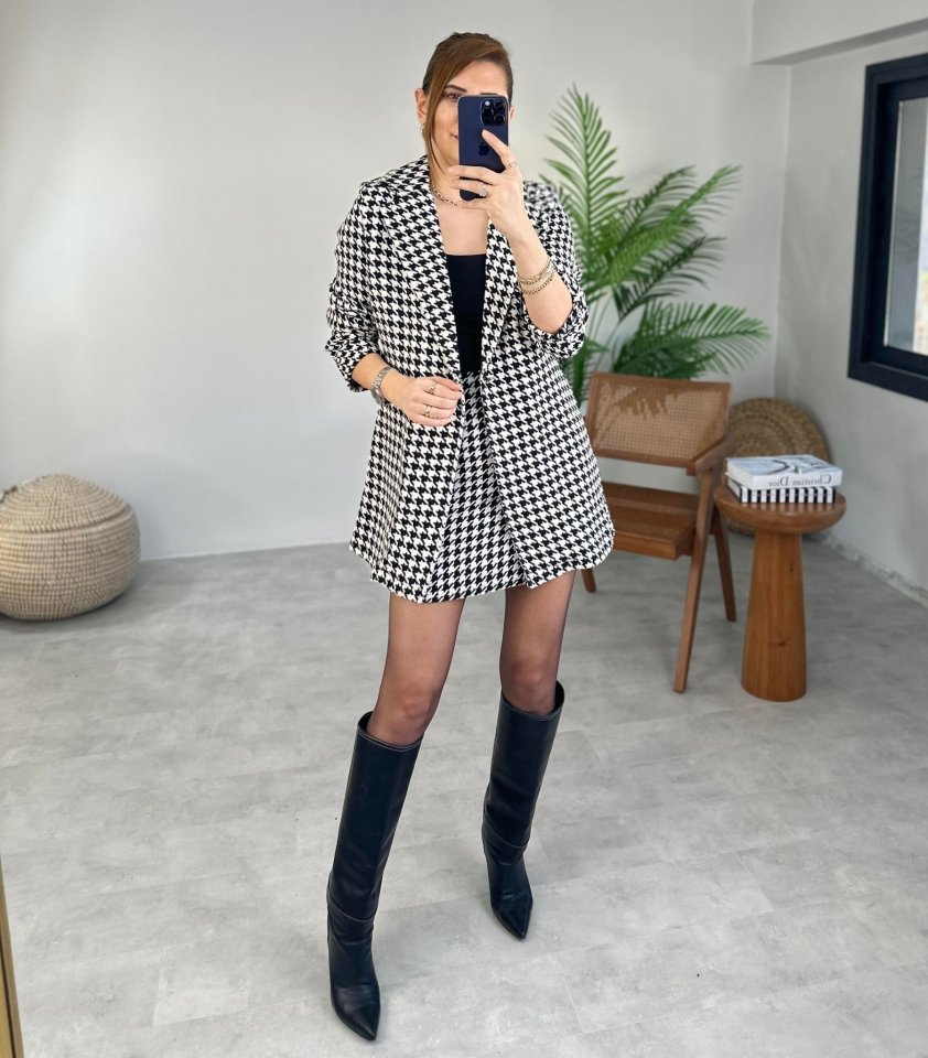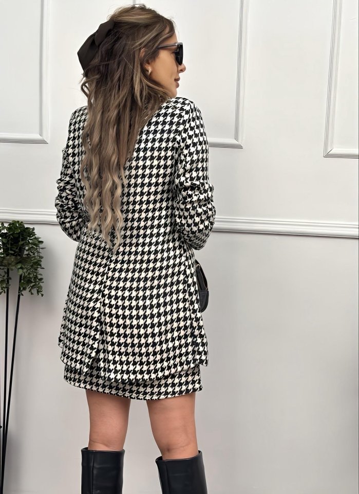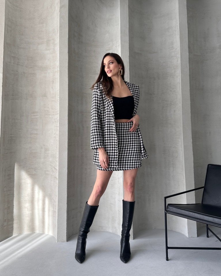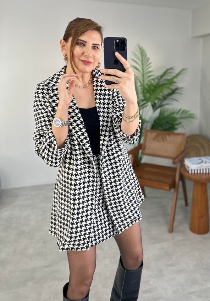 Kadın Kazayağı Desen Vatka Detay Kaban Ve Yüksek Bel Etek Ikili Takım