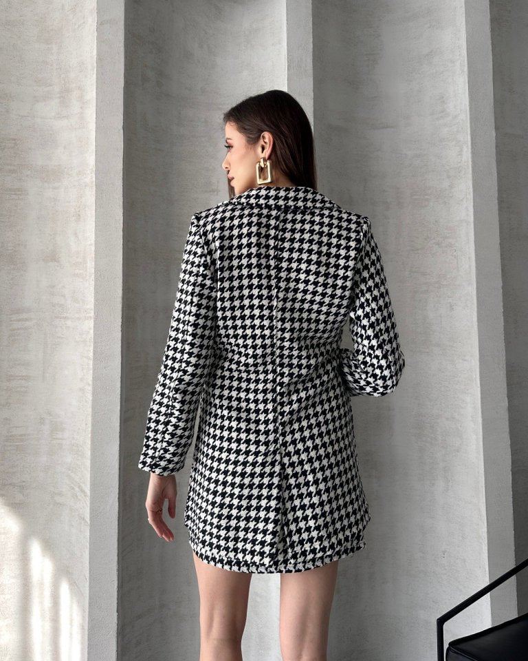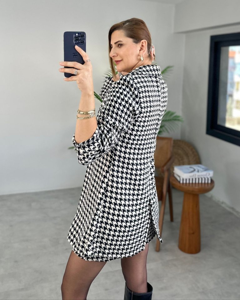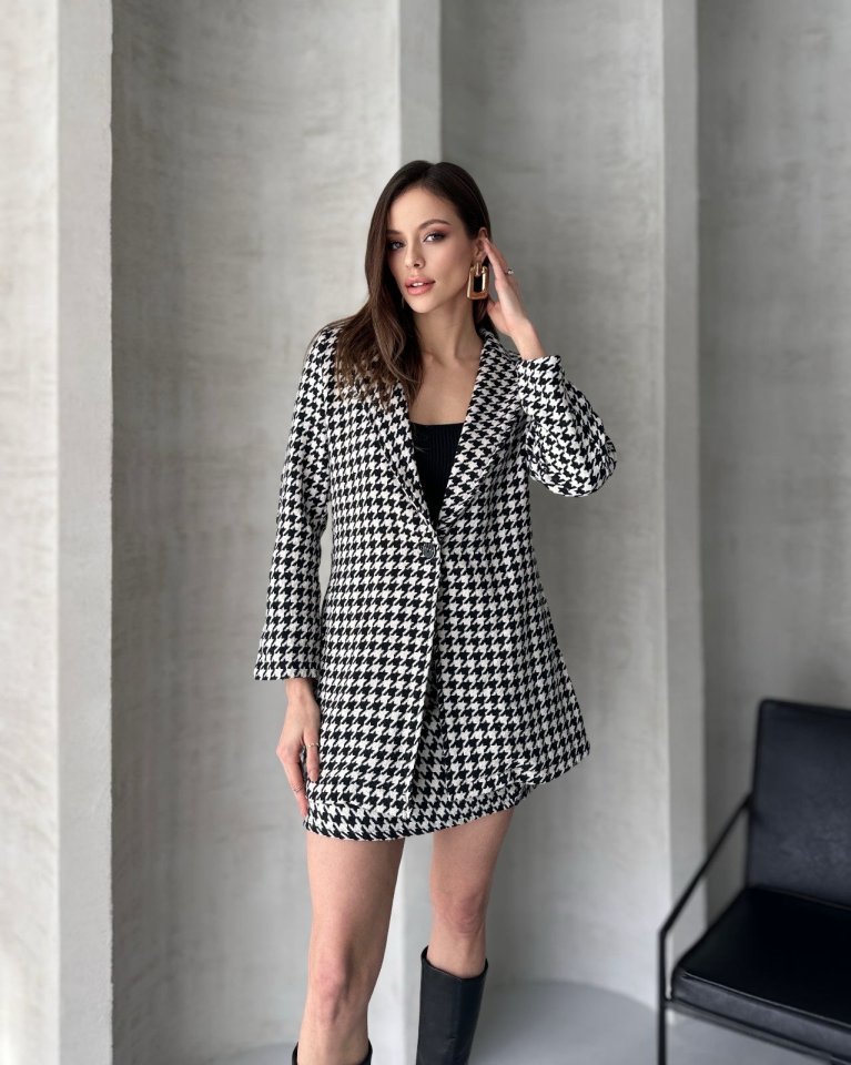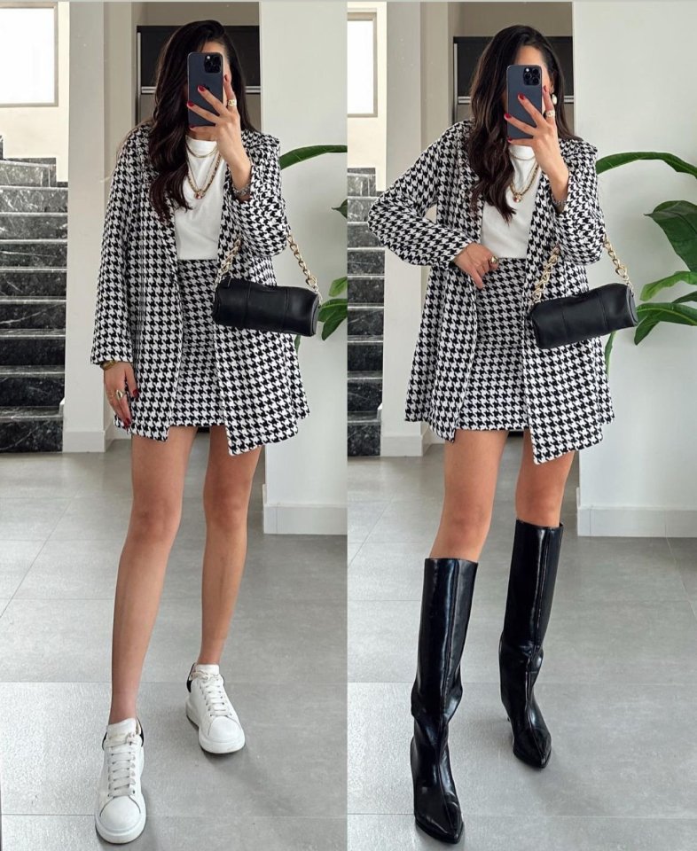 Kadın Kazayağı Desen Vatka Detay Kaban Ve Yüksek Bel Etek Ikili Takım