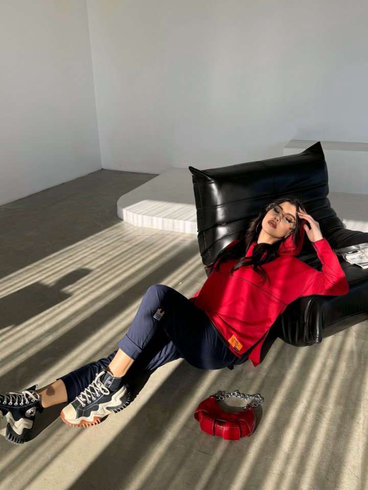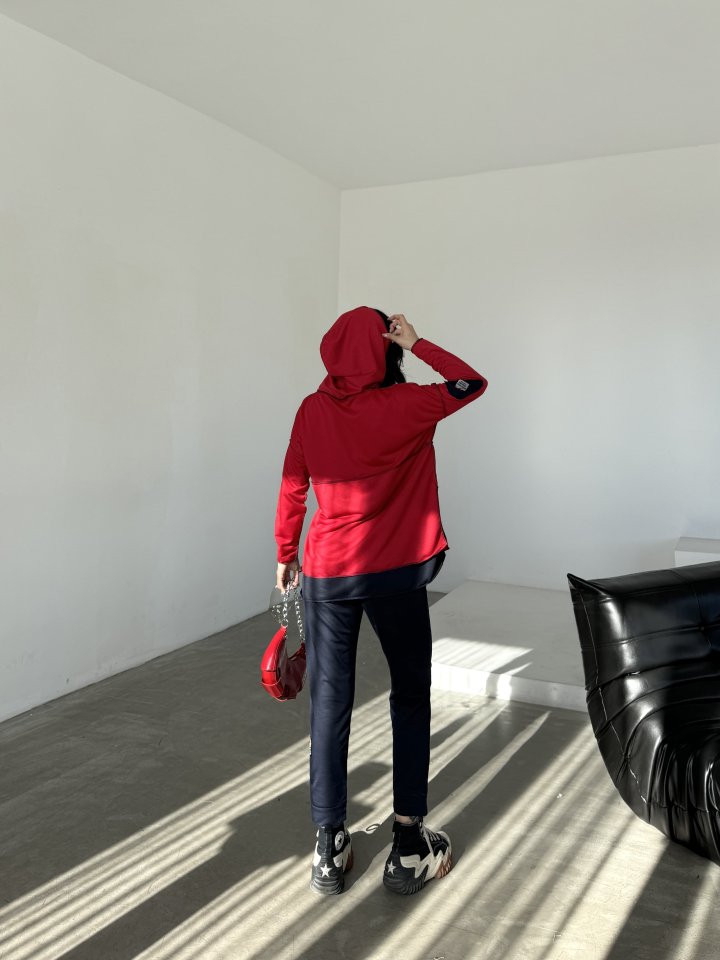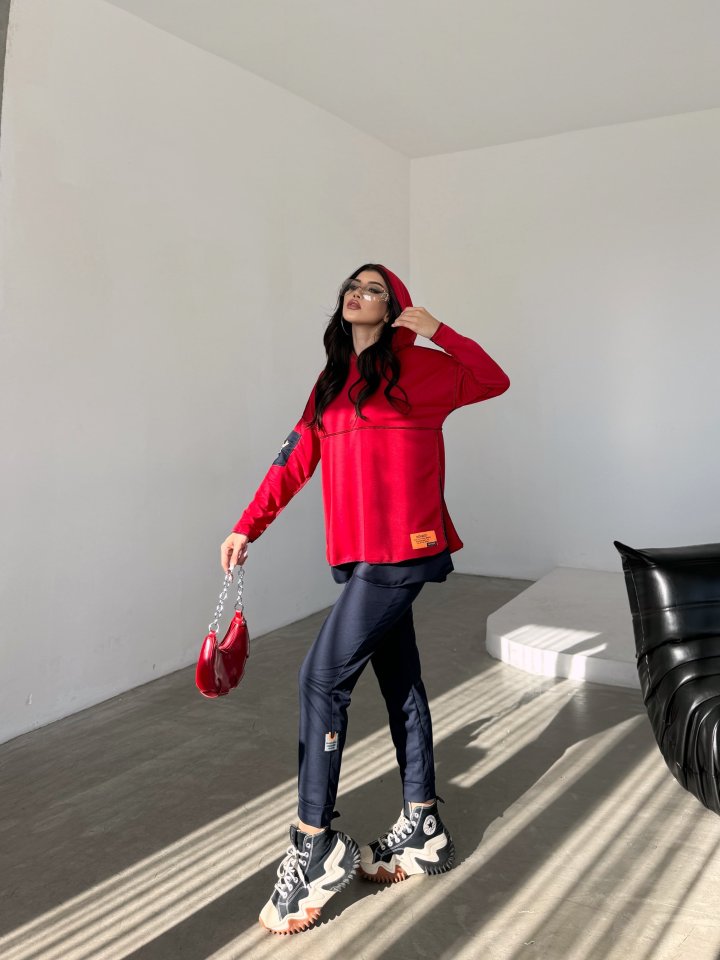 Kadın Kırmızı Kapşonlu Etek Ucu Detay Arma Ters Dikiş Gorunumlu Ikili Takım