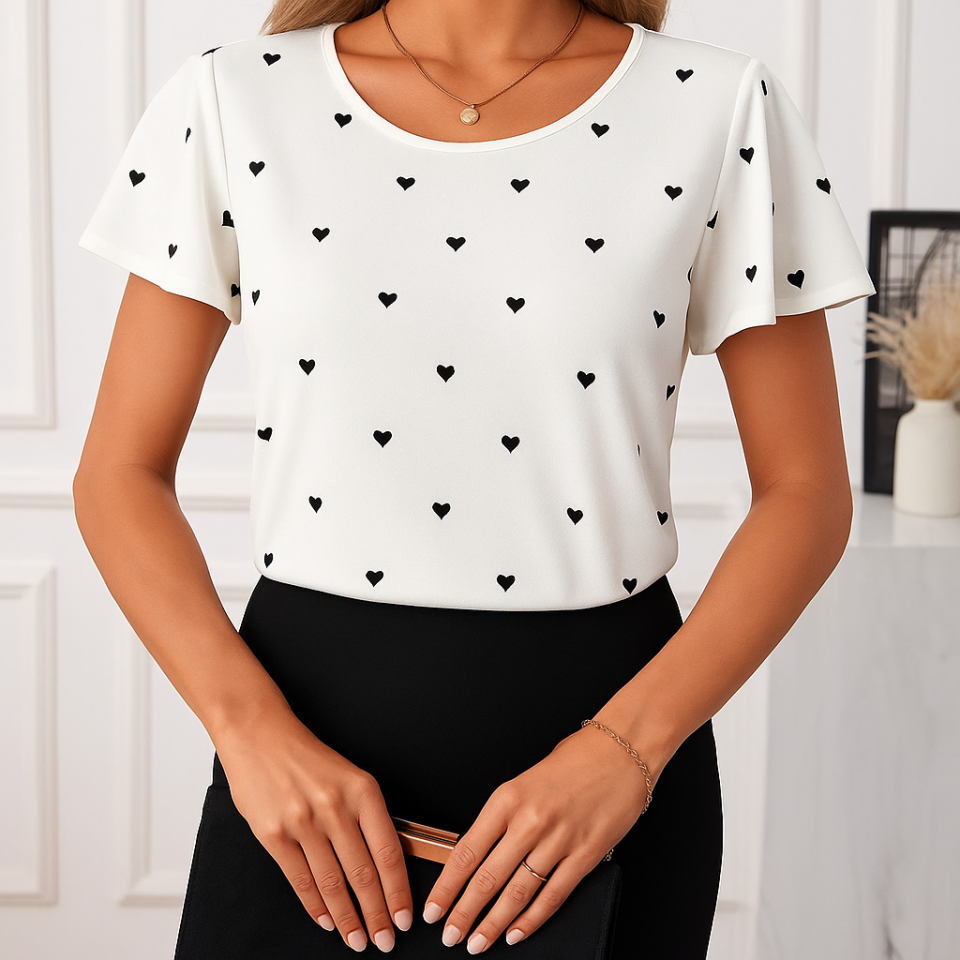 Kadın Kısa Kelebek Kollu Bisiklet Yaka Kalp Desenli Süprem Bluz