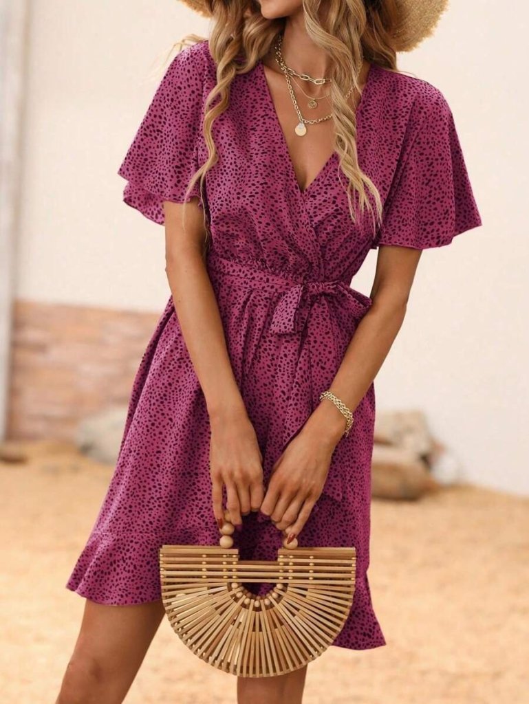 Kadın Kısa Kelebek Kollu Kruvaze Yakalı Belden Kuşaklı Kısa Desenli Süprem Elbise