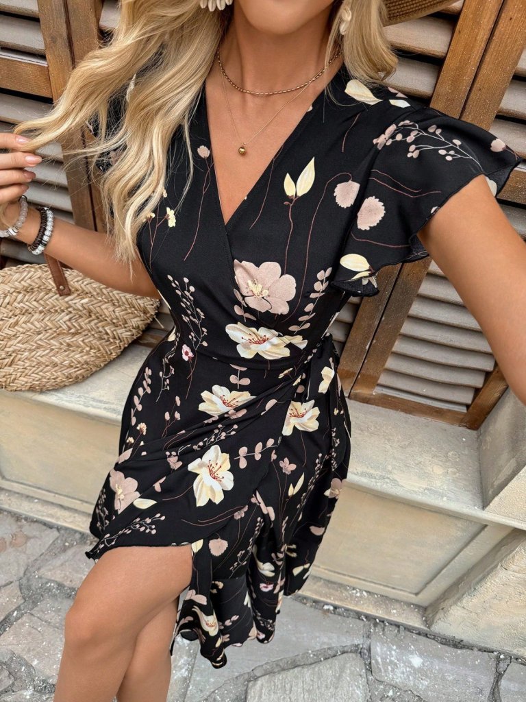 Kadın Kısa Kelebek Kollu Kruvaze Yakalı Belden Kuşaklı Midi Süprem Elbise