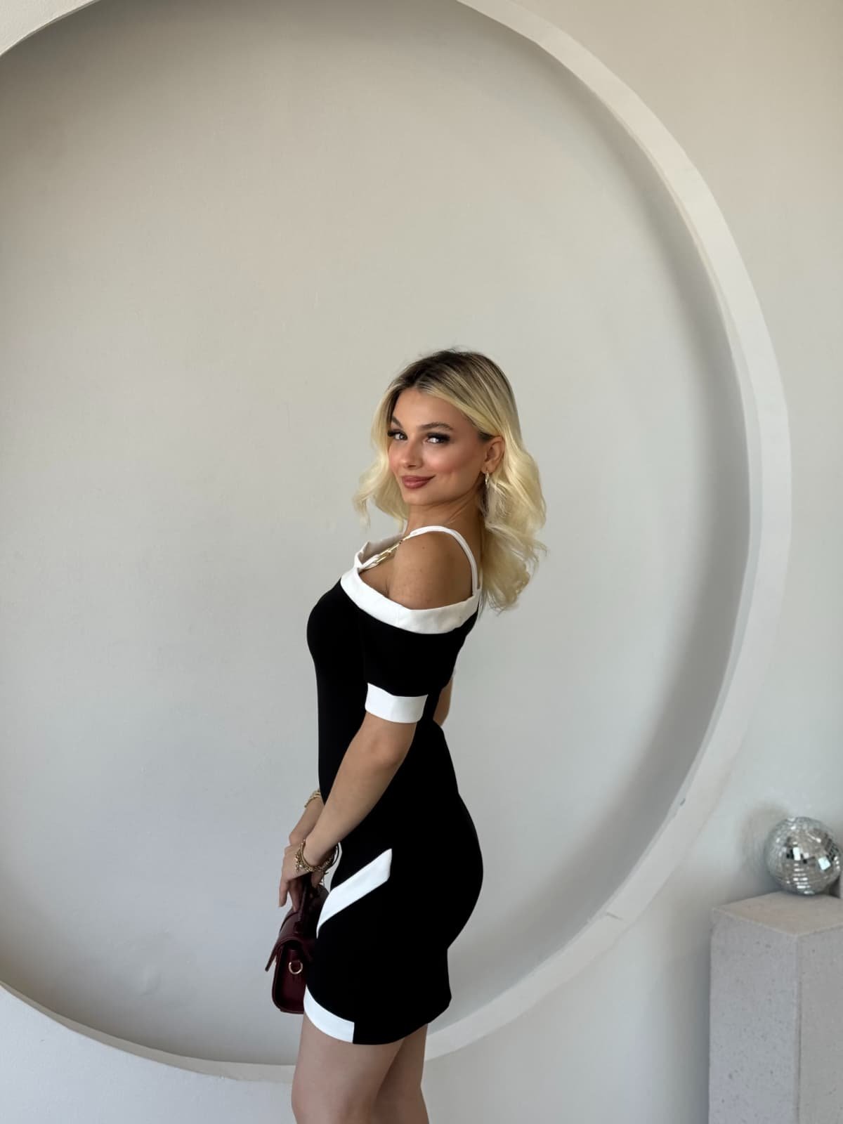 Kadın Kısa Kollu Asimetrik Kesim Yaka şerit Ve Aksesuar Detaylı Modal Elbise