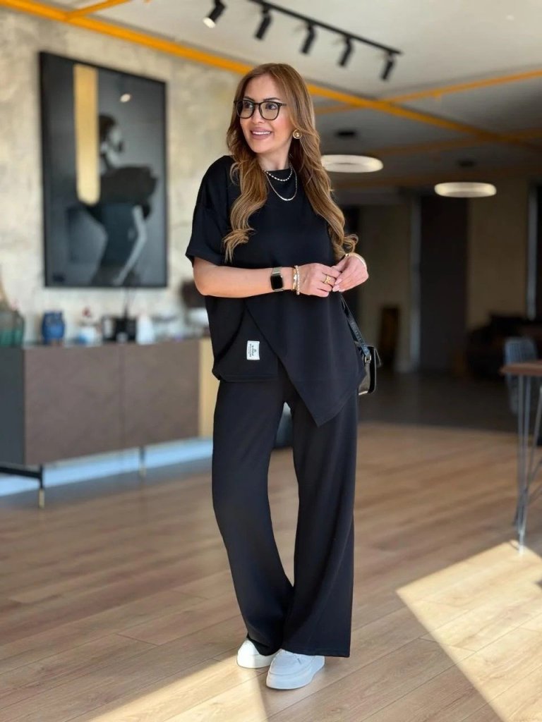 Kadın Kısa Kollu Bisiklet Yaka Asimetrik Viskon Iki Iplik Bluz Ve Pantolon Ikili Takım
