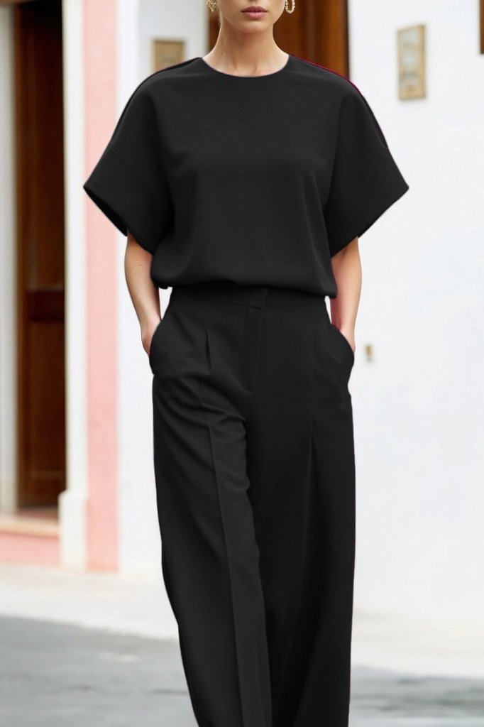 Kadın Kısa Kollu Bisiklet Yaka Bluz Yüksek Bel Cep Detaylı Pantolon Atlas Ikili Takım