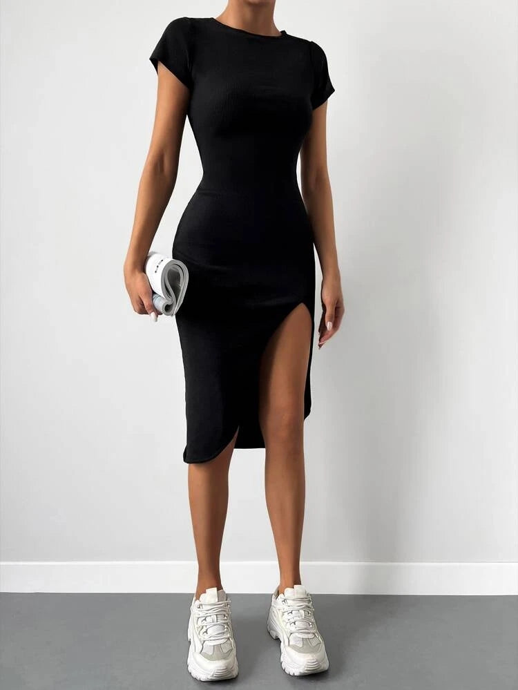 Kadın Kısa Kollu Bisiklet Yaka Derin Yırtmaçlı Kaşkorse Elbise