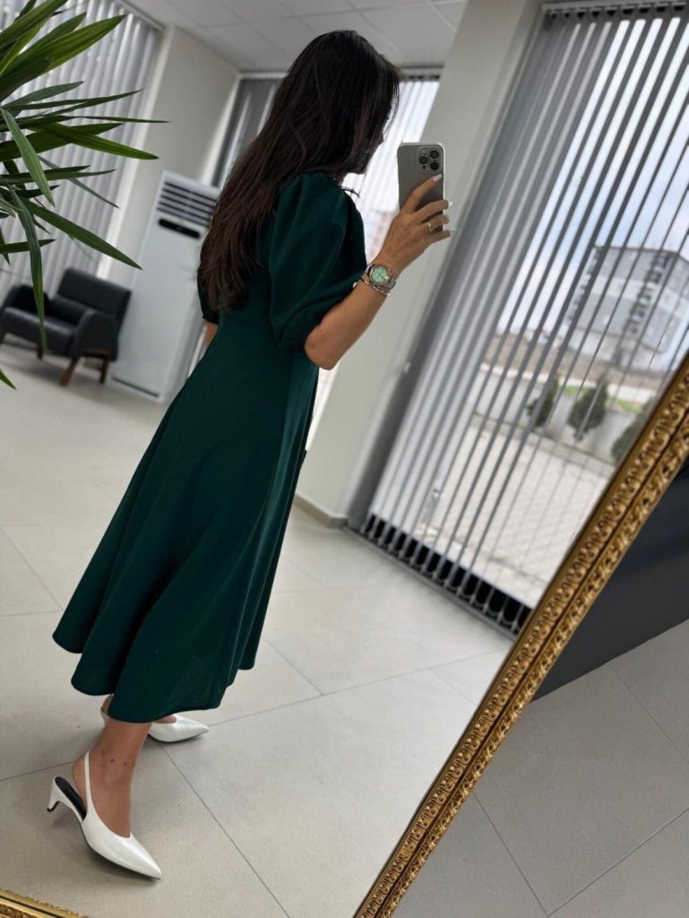Kadın Kısa Kollu Bisiklet Yaka Fiyonk Broşlu Midi Janjan Krep Elbise