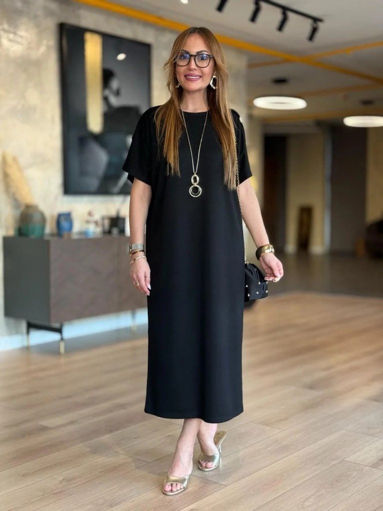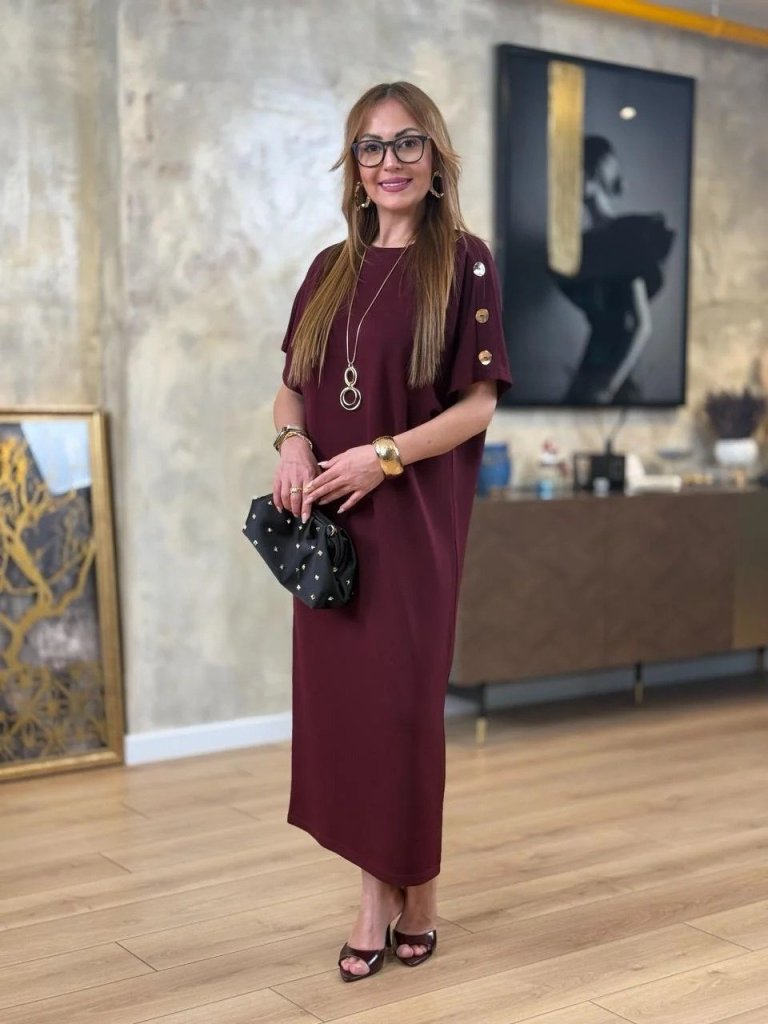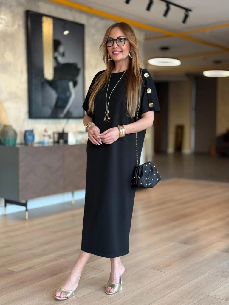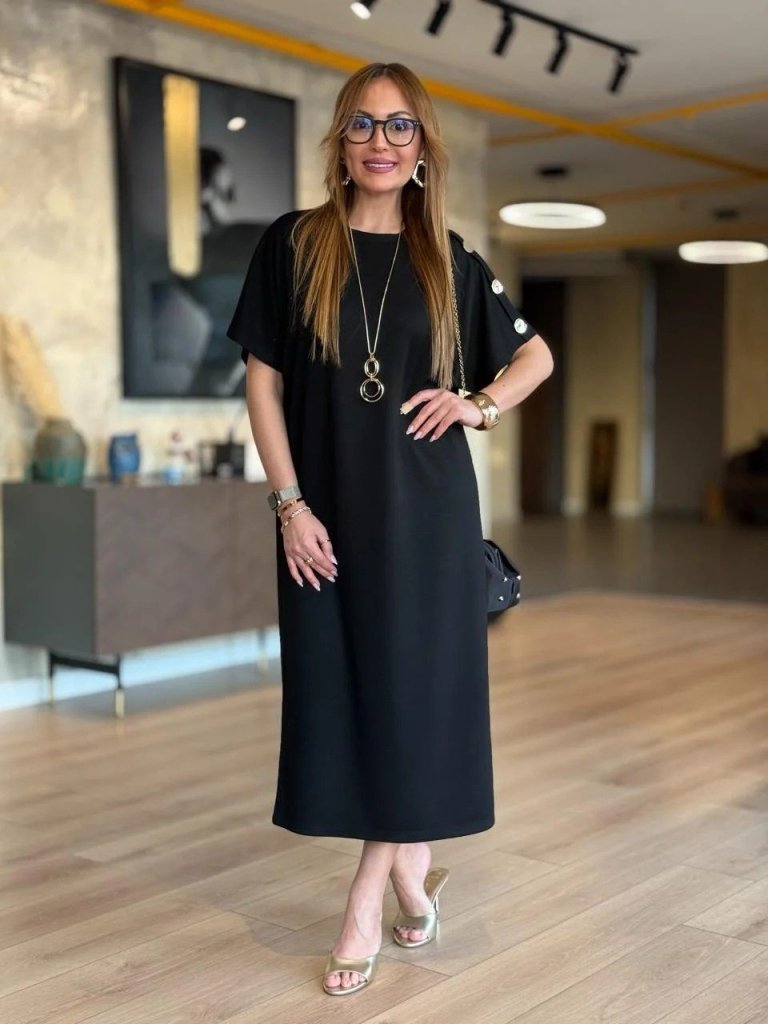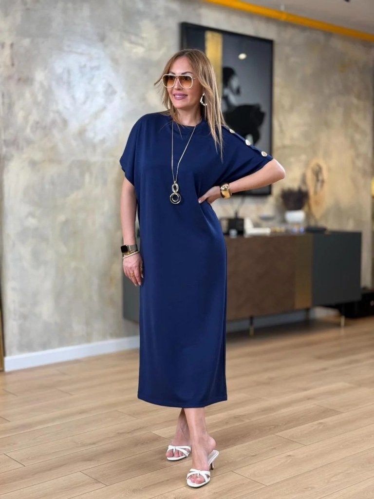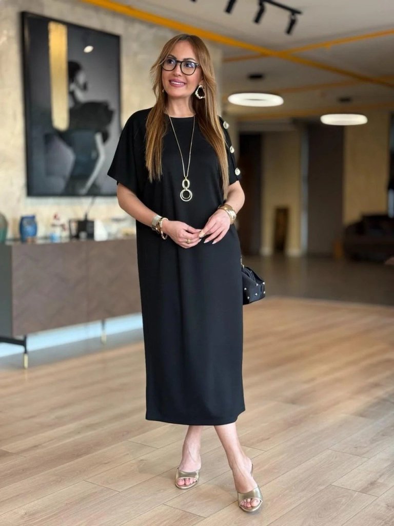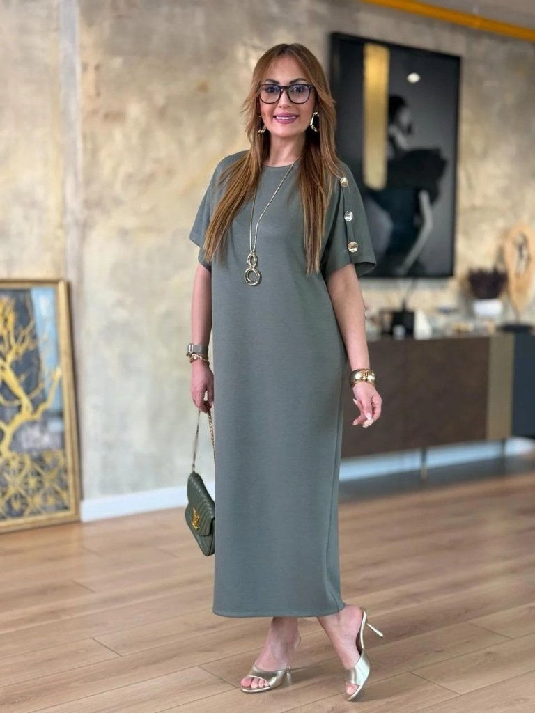 Kadın Kısa Kollu Bisiklet Yaka Omuzdan Düğmeli Uzun Viskon Iki Iplik Elbise