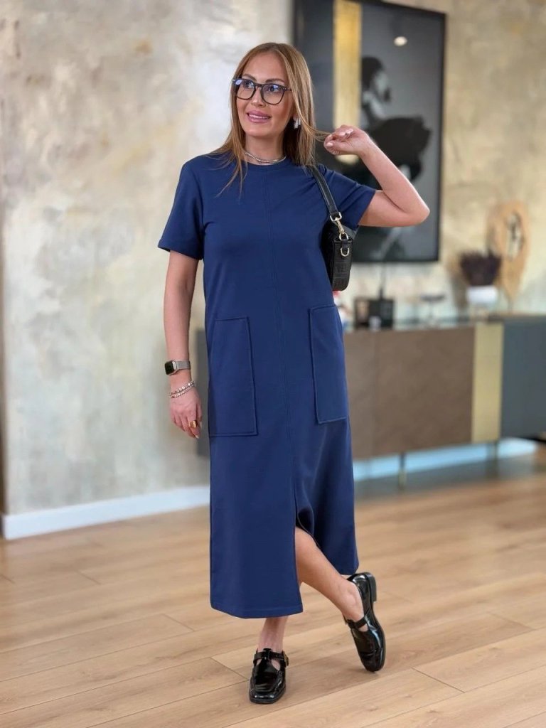 Kadın Kısa Kollu Bisiklet Yakalı Cepli önden Yırtmaçlı Viskon Iki Iplik Midi Elbise