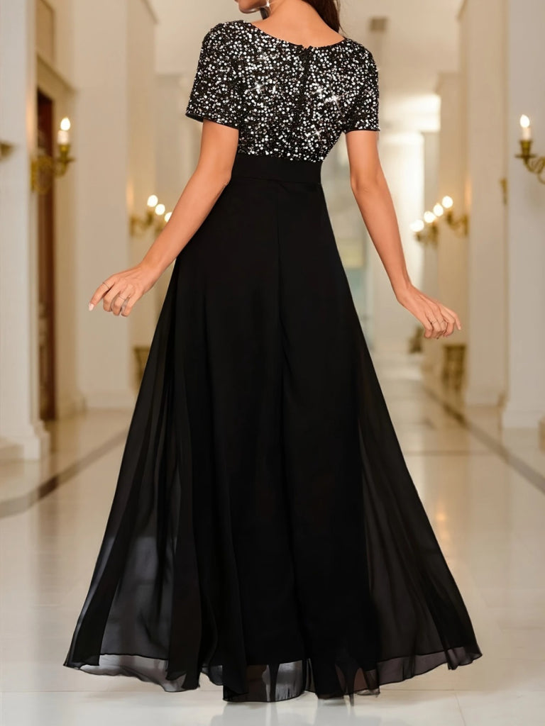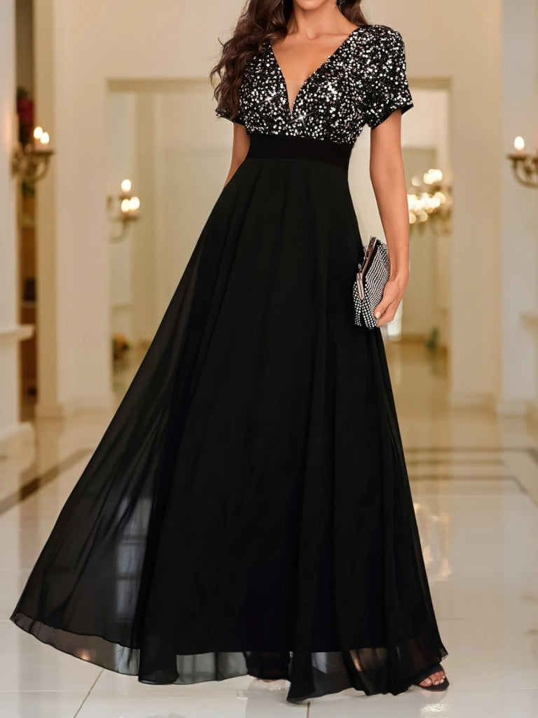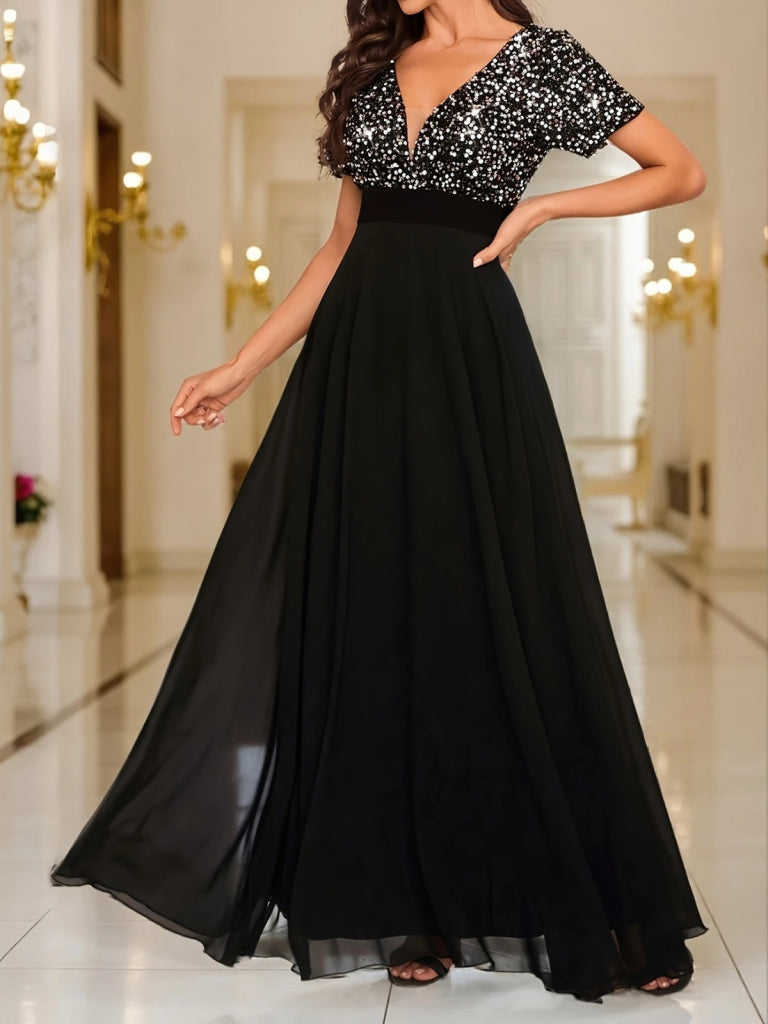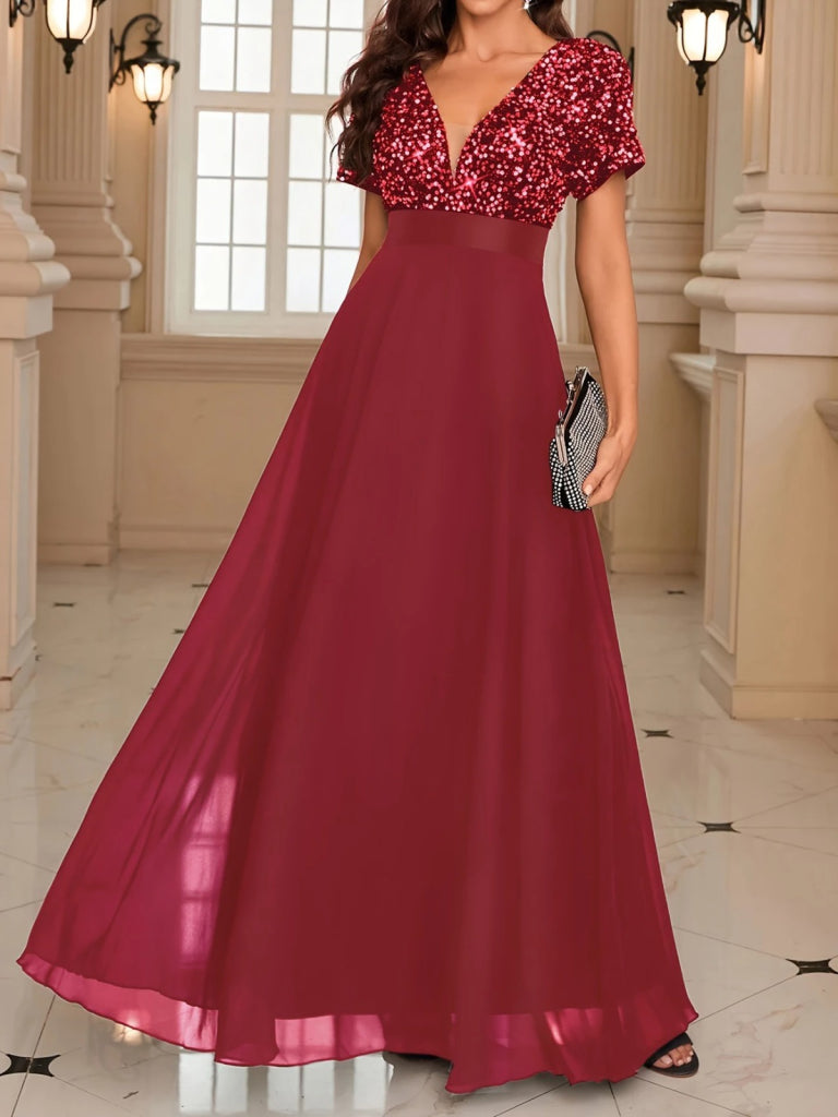 Kadın Kısa Kollu Derin V Yakalı A Kesim Pulpayet Detaylı şifon Nedime Elbisesi
