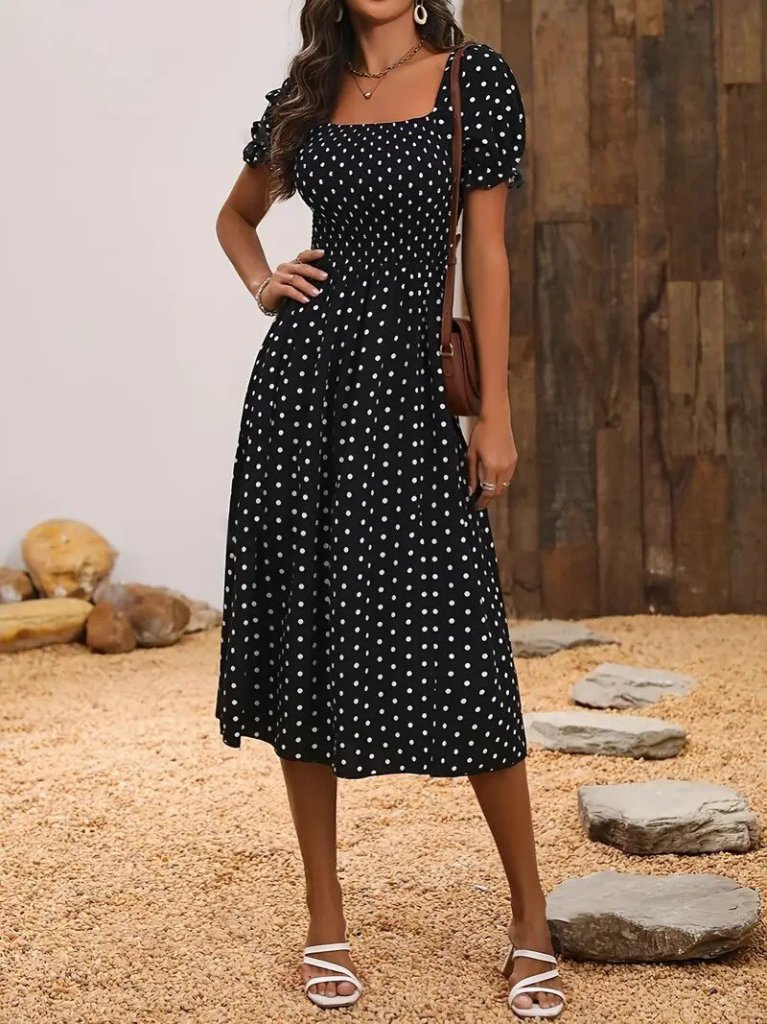 Kadın Kısa Kollu Geometrik Yaka Yırtmaçlı Puantiyeli Midi örme Krep Elbise