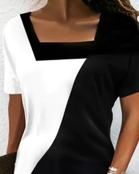 Kadın Kısa Kollu Kare Yaka Parçalı Desen Dalgıç Elbise