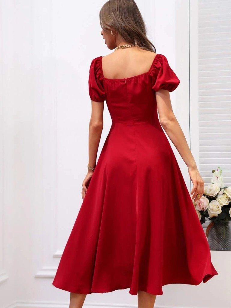Kadın Kısa Kollu Kare Yakalı Yırtmaçlı Midi Janjan Krep Elbise