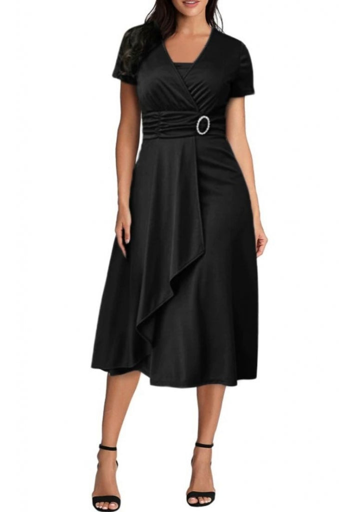 Kadın Kısa Kollu Kruvaze Yaka Kuşak Ve Toka Detay Krep Elbise