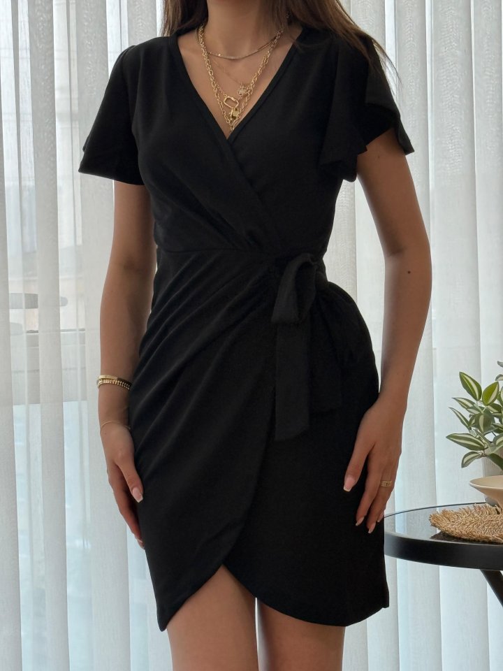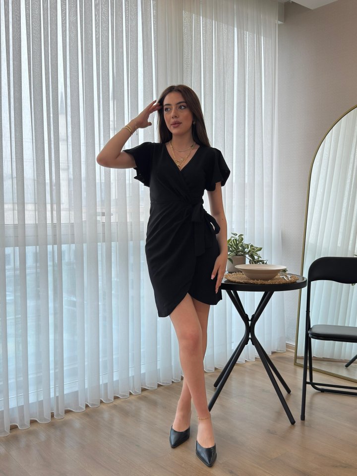 Kadın Kısa Kollu Kruvaze Yakalı Belden Bağlamalı Ithal Krep Elbise