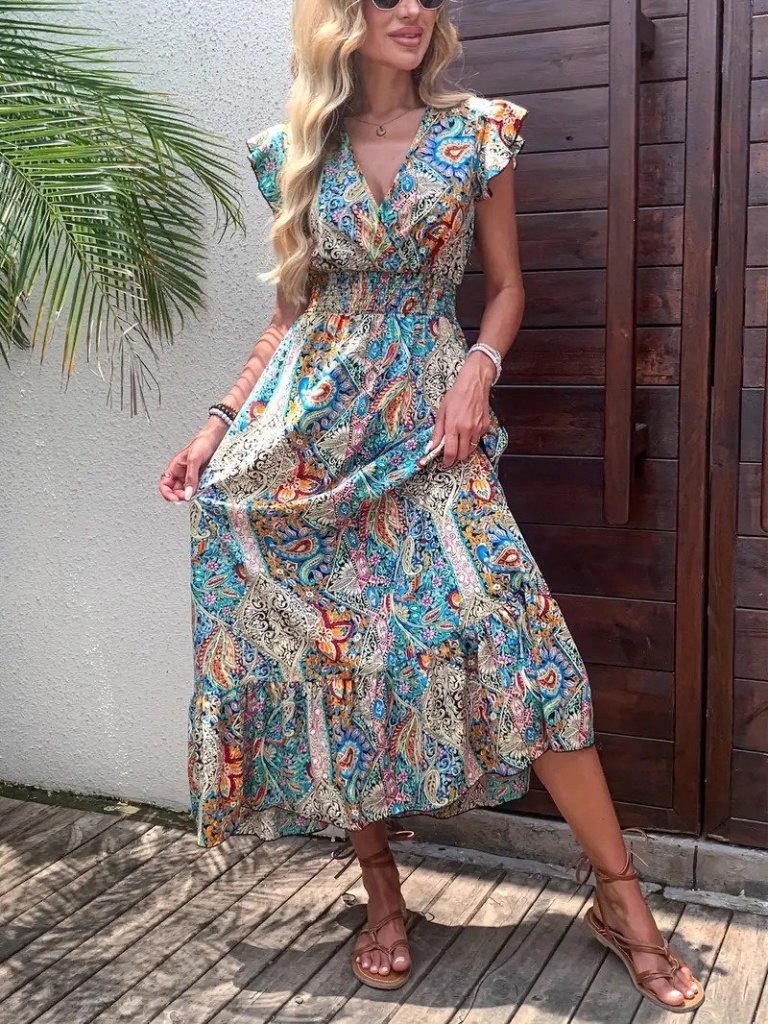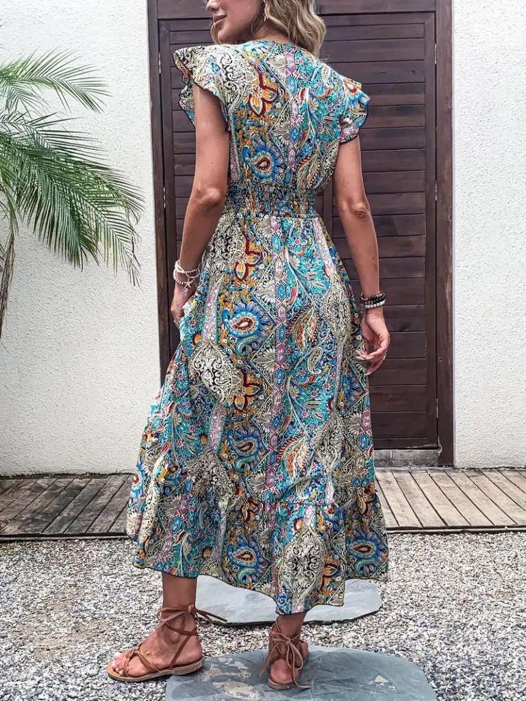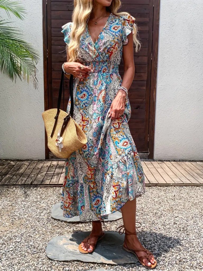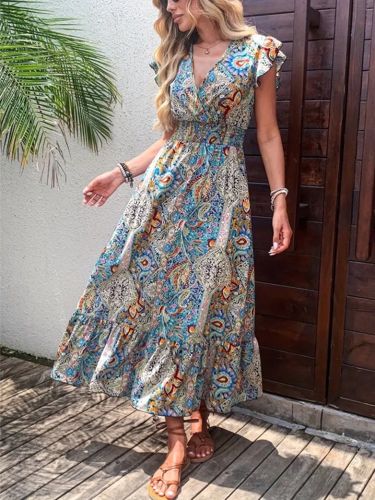 Kadın Kısa Kollu Kruvaze Yakalı Desenli Maxi Elbise