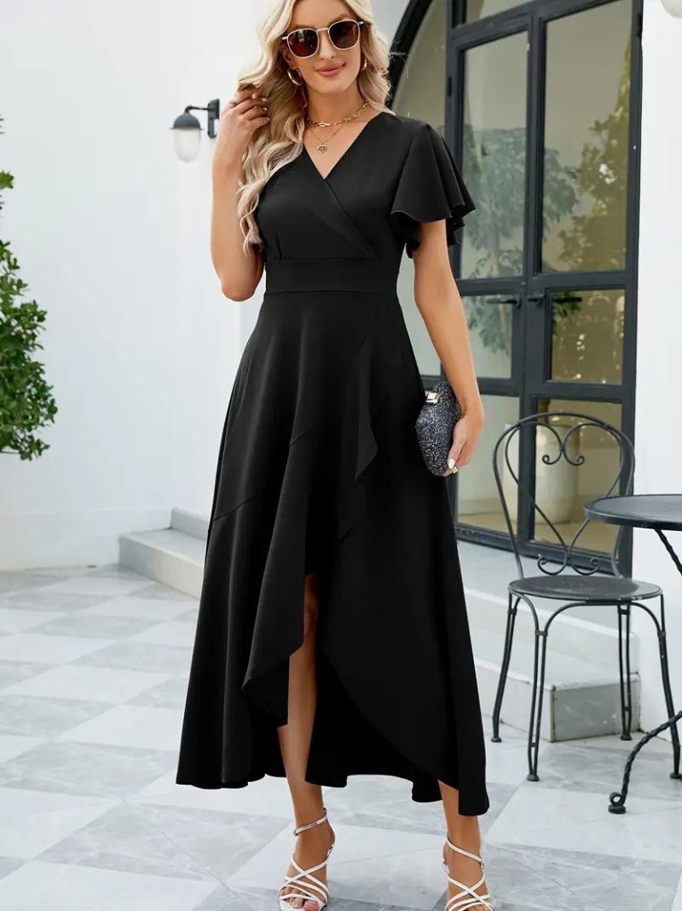 Kadın Kısa Kollu Kruvaze Yakalı önden Volanlı çapraz Kesim Detaylı Maksi Boy Ithal Krep Elbise