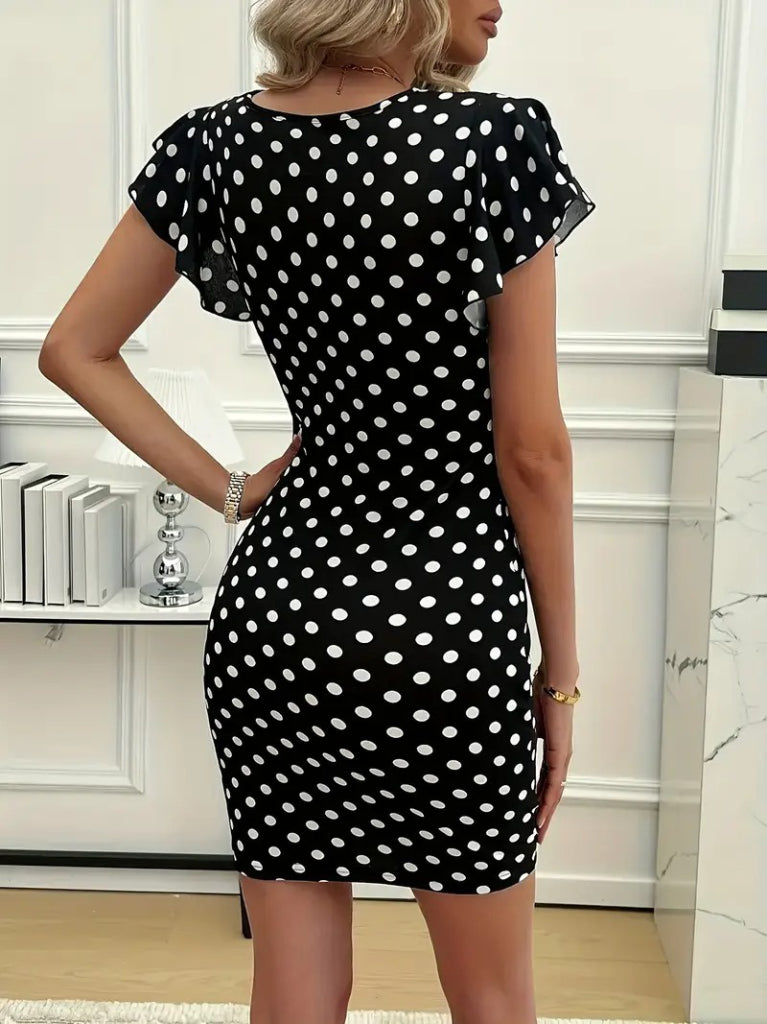 Kadın Kısa Kollu Kruvaze Yakalı örme Puantiyeli Krep Elbise