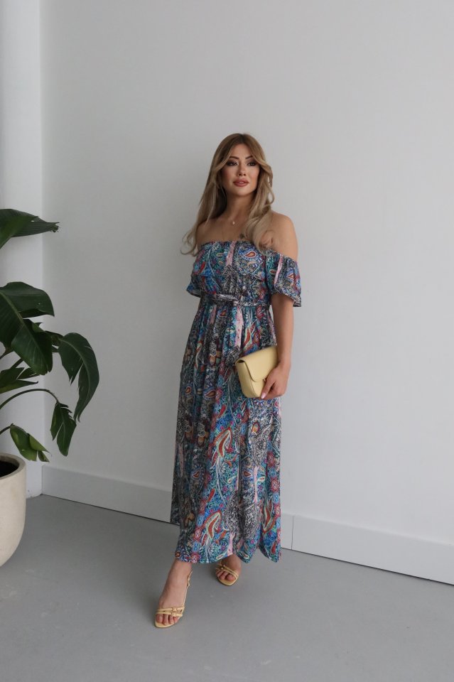 Kadın Kısa Kollu Madonna Yaka Fırfırlı Belden Yırtmaçlı Maksi Süprem Elbise