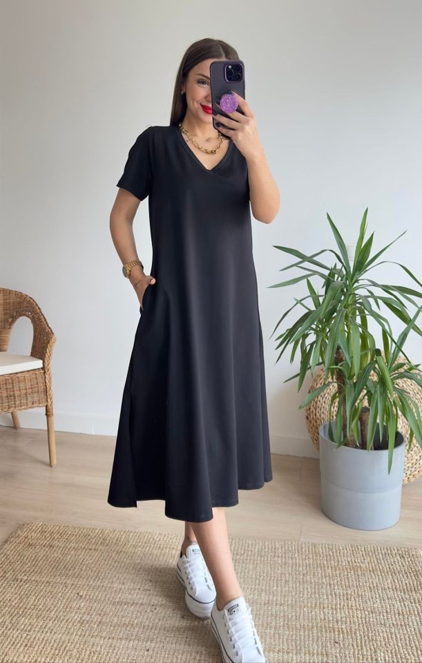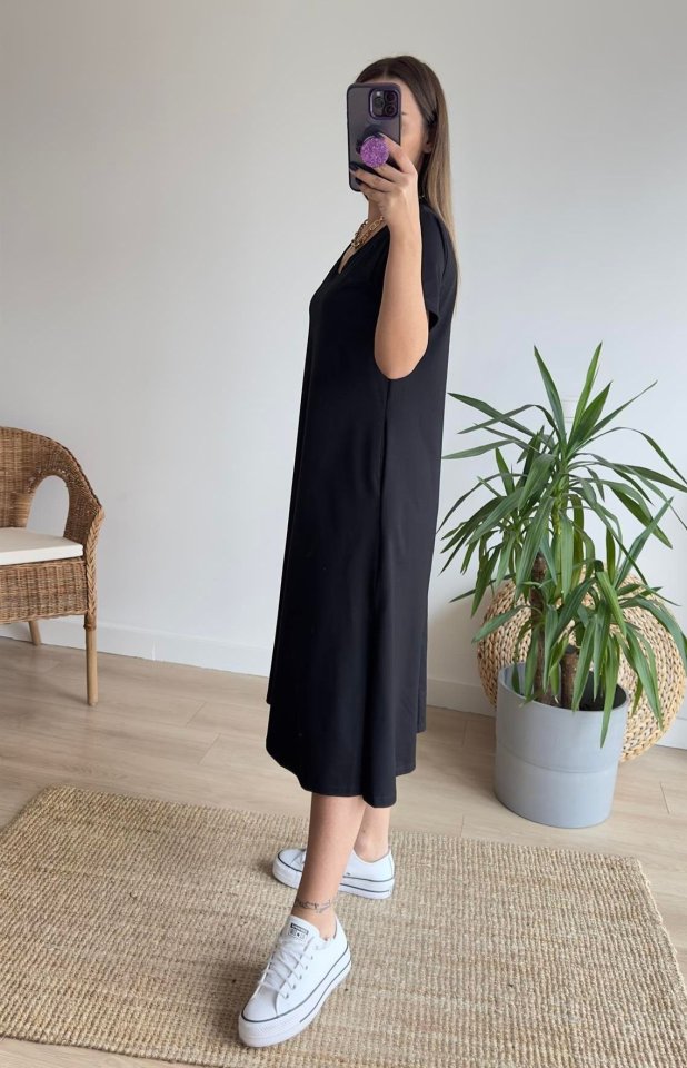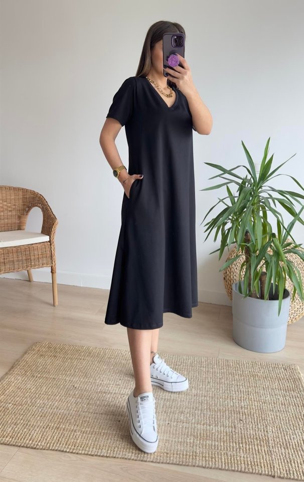 Kadın Kısa Kollu V Yaka Cepli A Kesim Detaylı Viskon Elbise