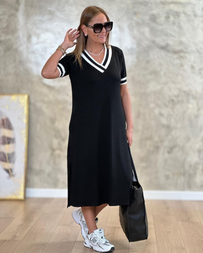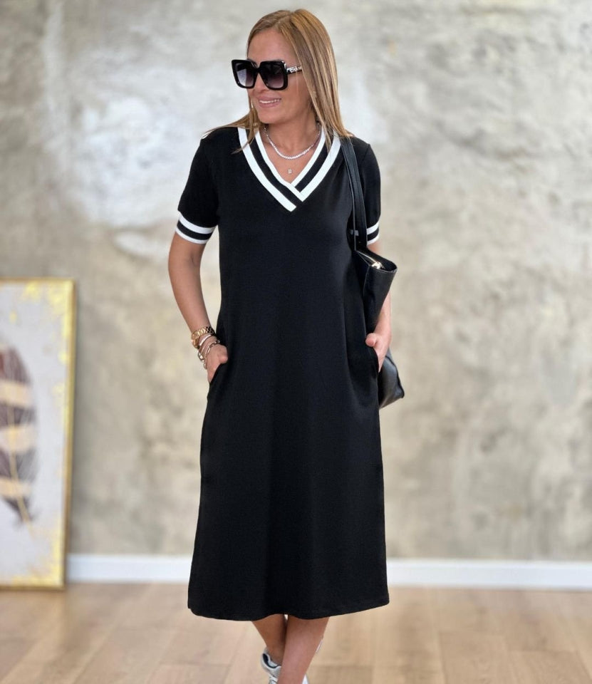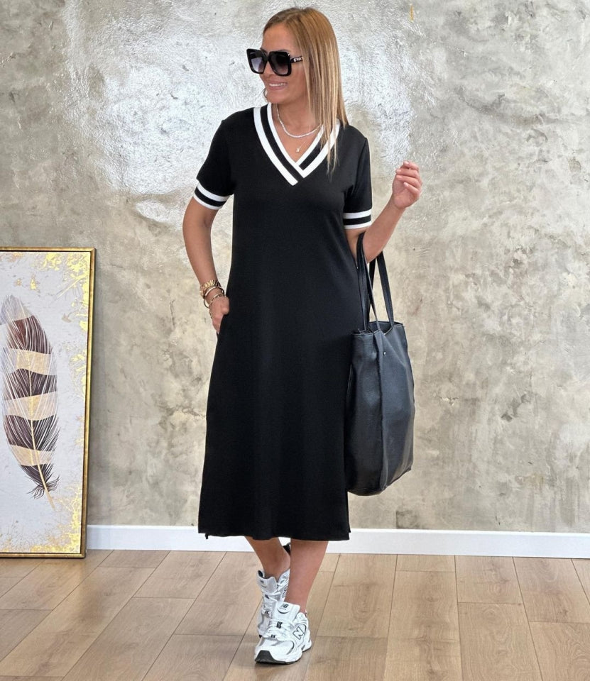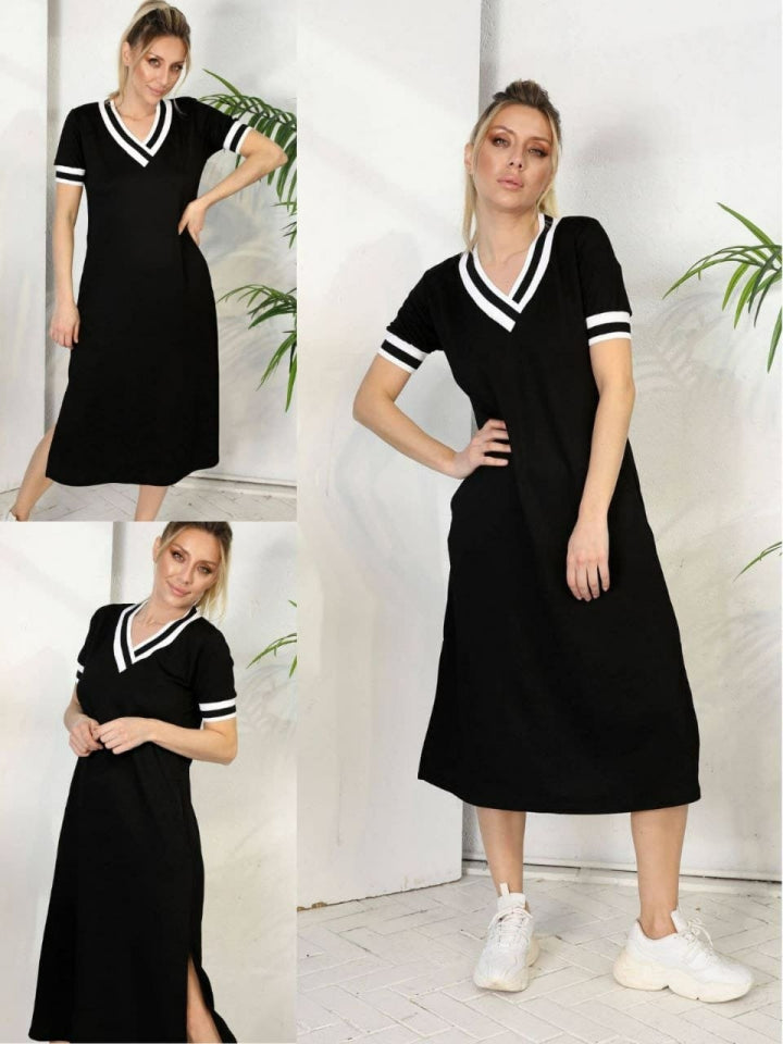 Kadın Kısa Kollu V Yaka Kol Ve Yaka Ribana Detay Midi Boy Viskon Elbise