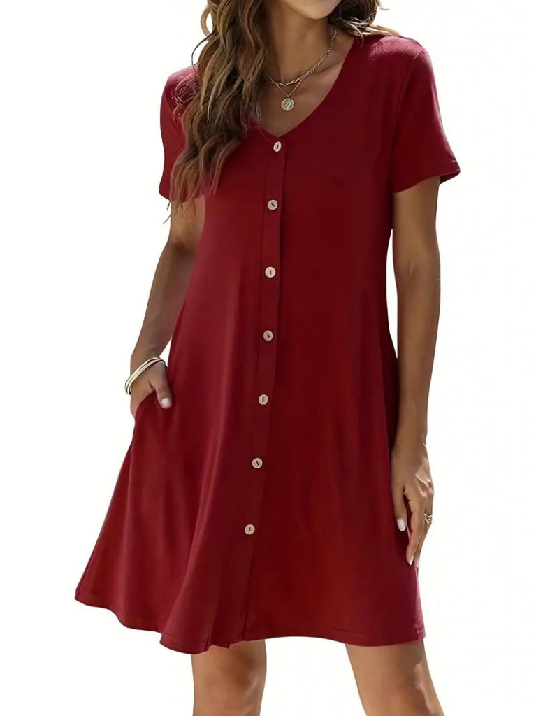Kadın Kısa Kollu V Yaka önü Düğmeli Viskon Elbise