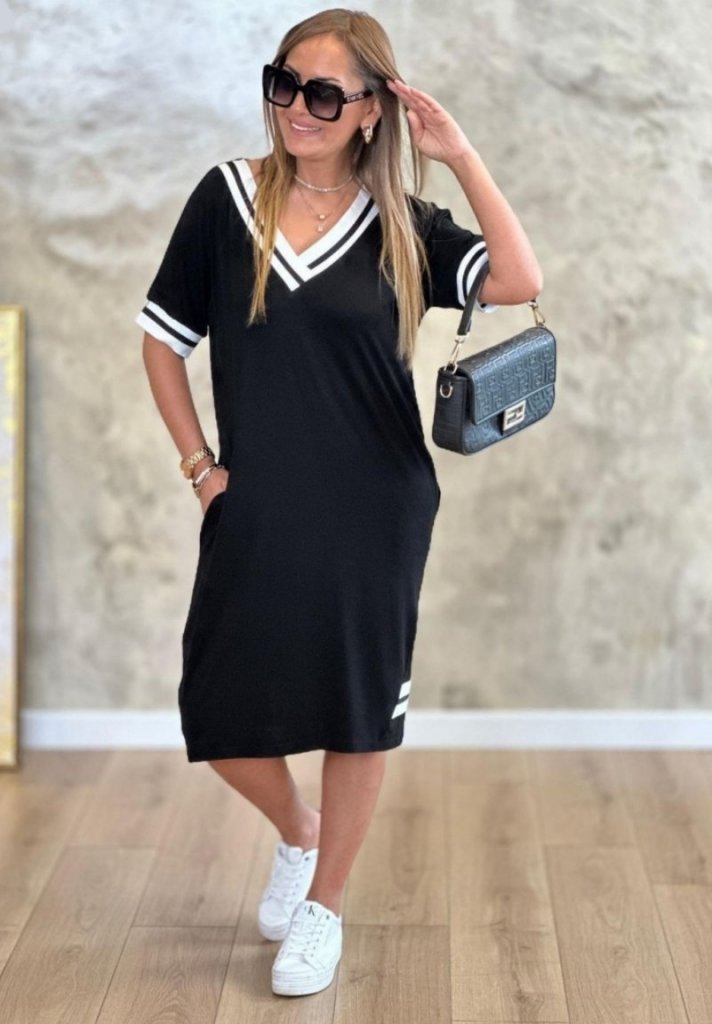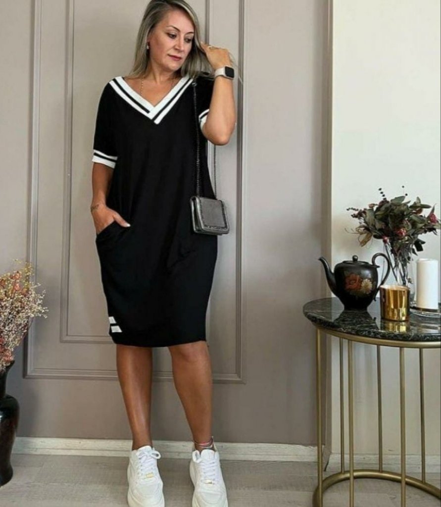 Kadın Kısa Kollu V Yaka Ribana Detaylı Cepli Dizüstü Viskon Elbise