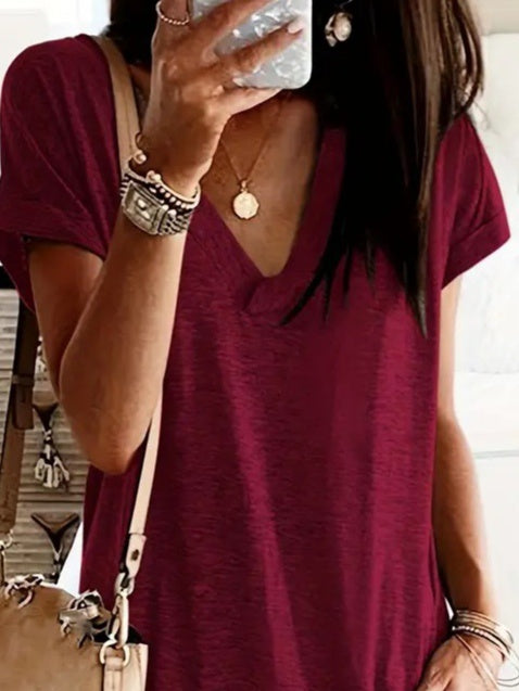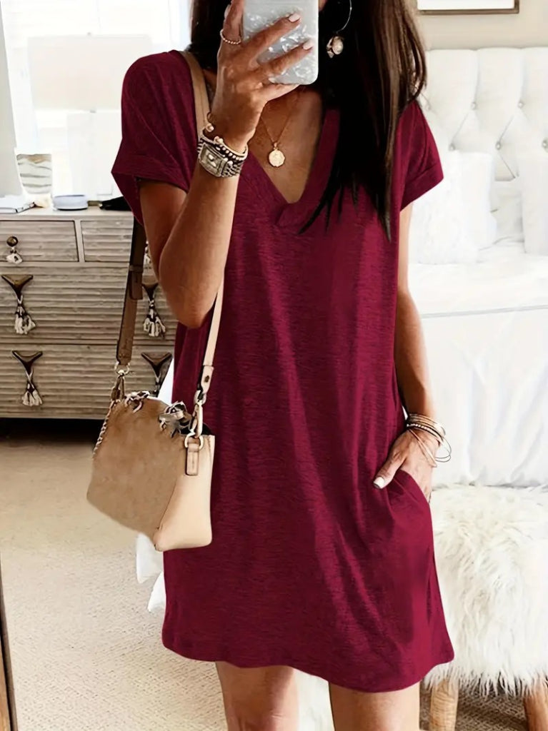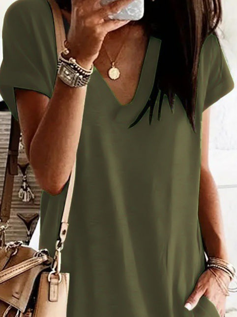 Kadın Kısa Kollu V Yakalı Cepli Kısa Viskon Elbise