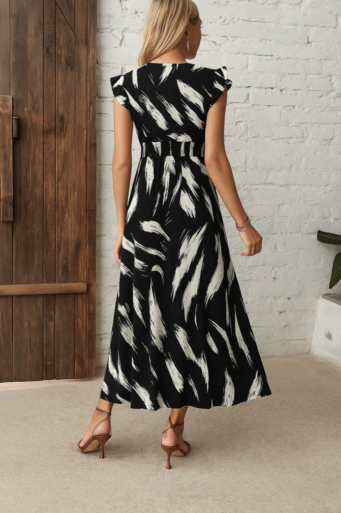 Kadın Kısa Kollu V Yakalı Desenli Yandan Yırtmaçlı Süprem Elbise