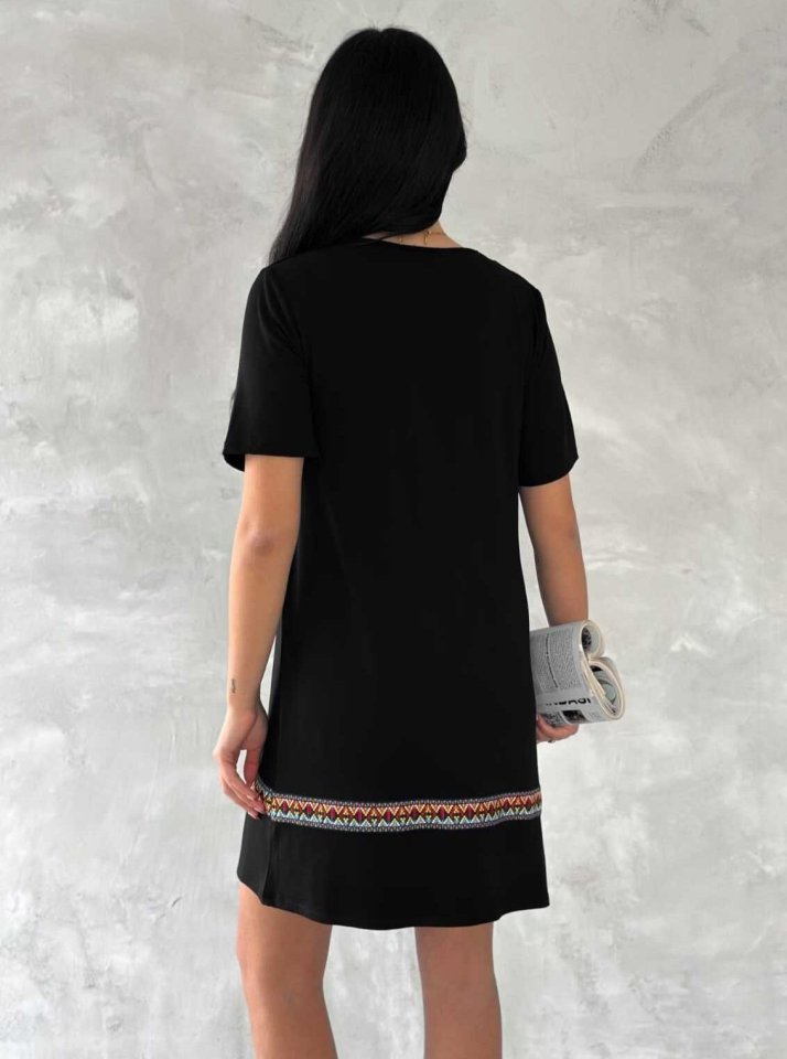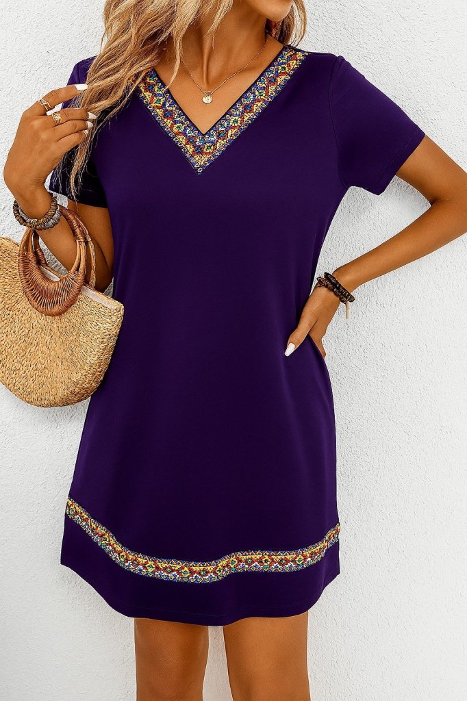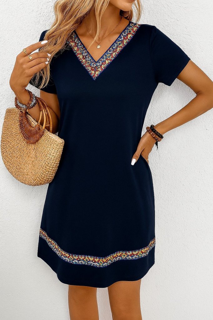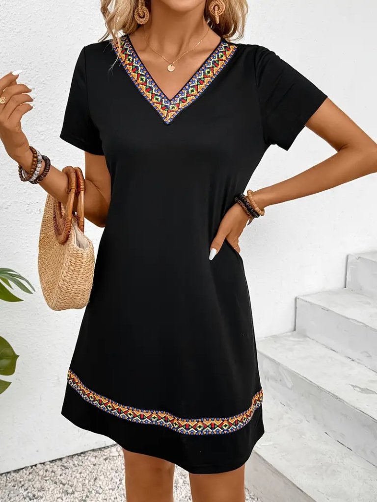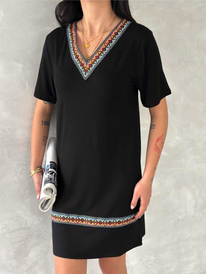Kadın Kısa Kollu V Yakalı Etnik Desen şerit Detaylı Viskon Elbise