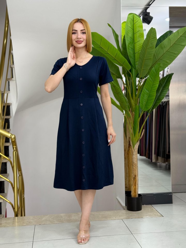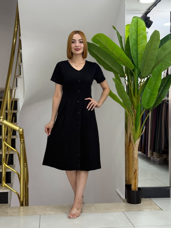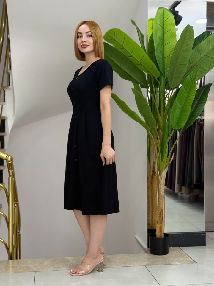 Kadın Kısa Kollu V Yakalı önden Düğmeli A Kesim Dokuma Elbise