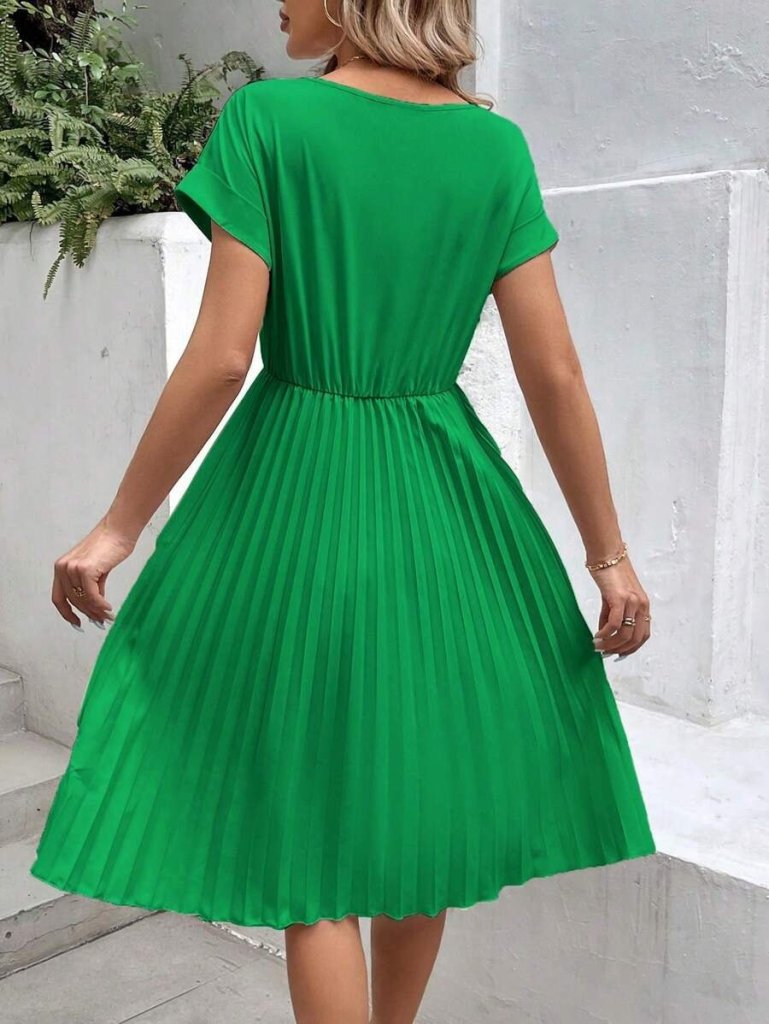 Kadın Kısa Kollu Yakası Açık Belden Lastikli Pileli Kısa Ithal Krep Elbise