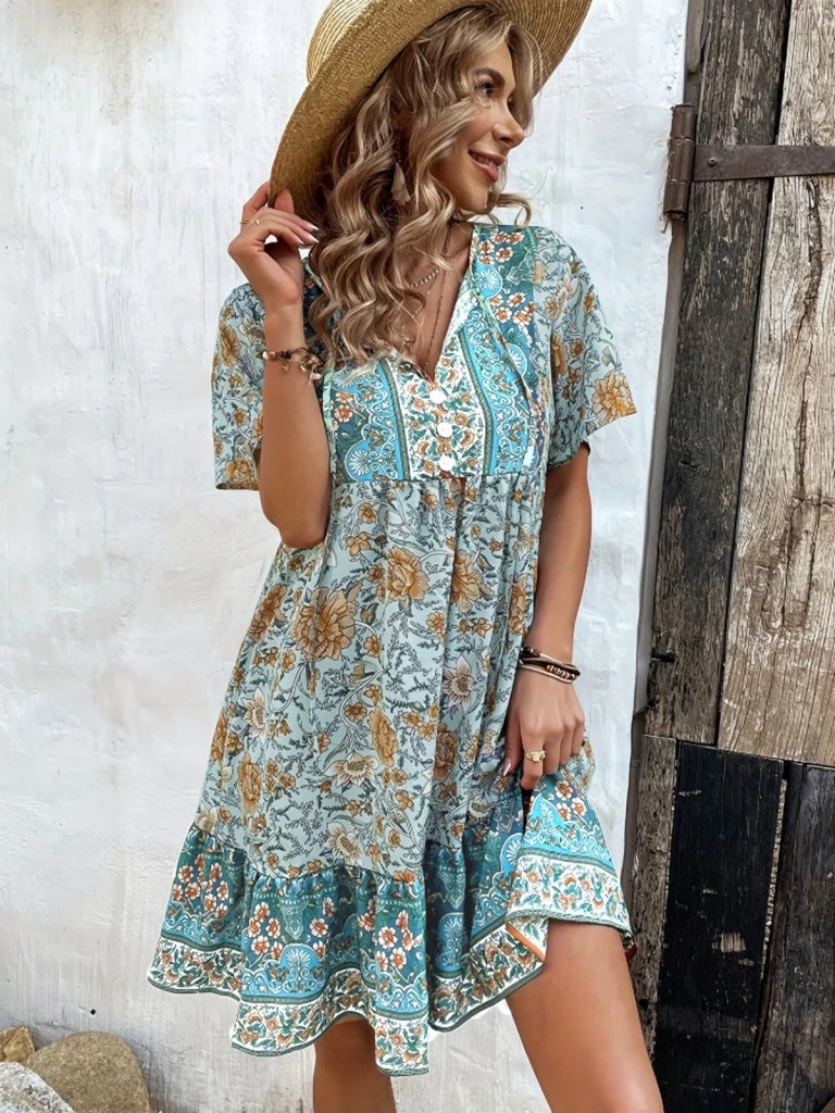 Kadın Kısa Kollu Yakası Bağcıklı önden Düğmeli Fırfır Desenli Süprem Elbise