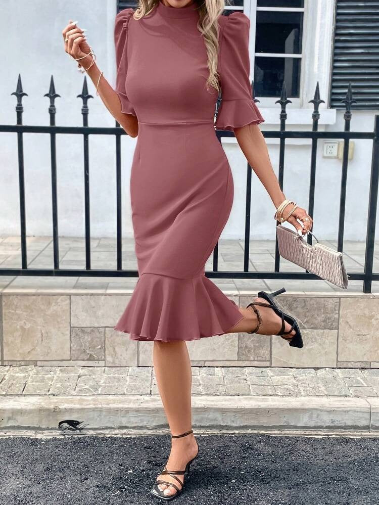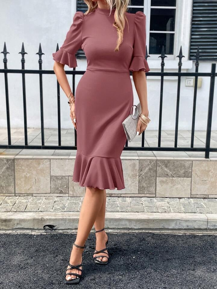 Kadın Kısa Kollu Yarı Balıkçı Yakalı Etek Ucu Fırfırlı Midi Ithal Krep Elbise