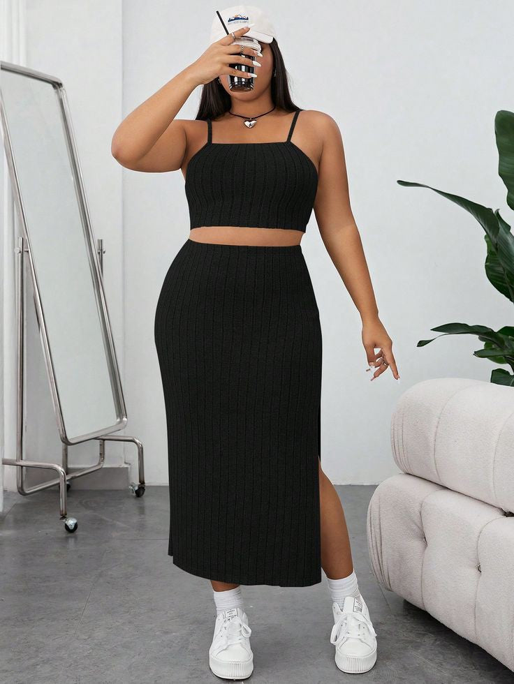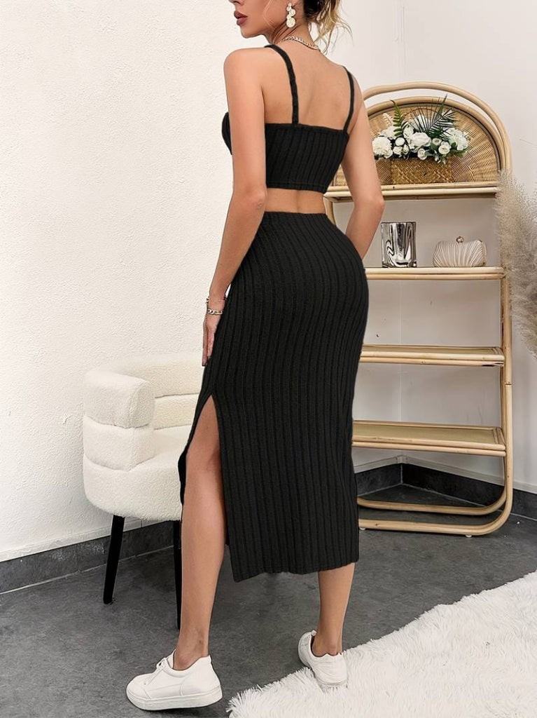 Kadın Kolsuz Askılı Crop Yırtmaçlı Midi Etek Fitilli Kaşkorse Takım