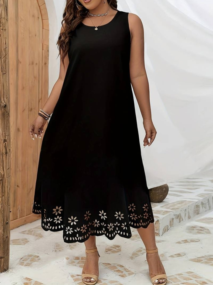 Kadın Kolsuz Etek Ucu Lazer Kesim çiçek Desenli Midi Boy Janjan Krep Elbise
