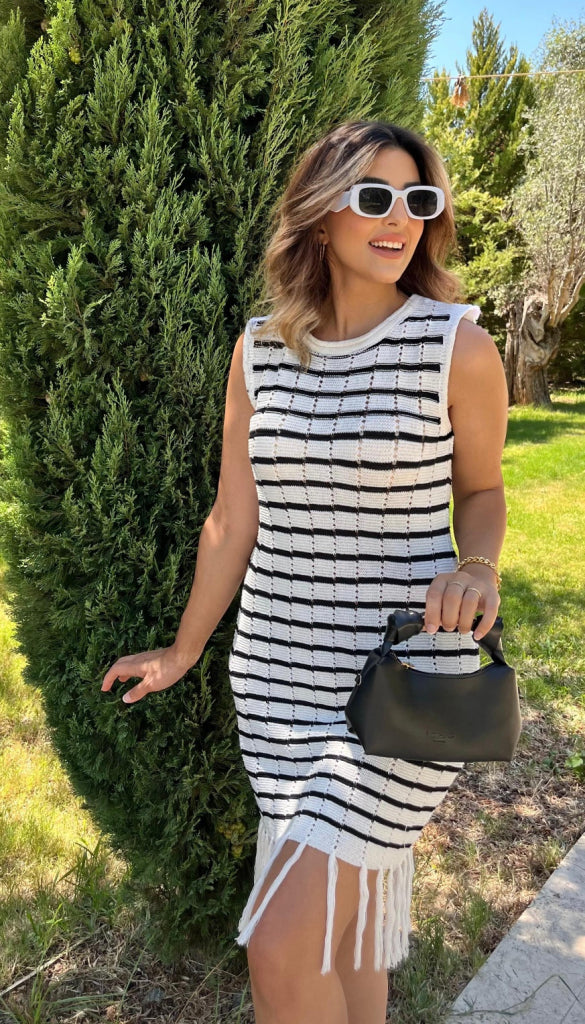Kadın Kolsuz V Yaka Eteği Püsküllü çizgi Desen Triko Elbise