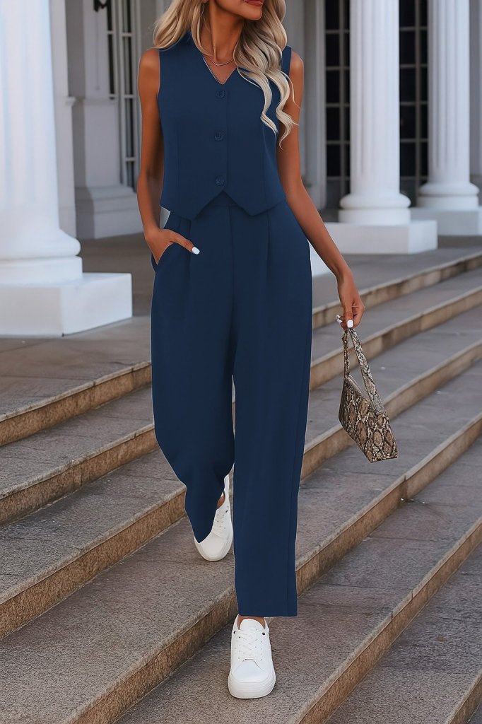 Kadın Kolsuz V Yakalı önden Düğmeli Ithal Krep Ve Pantolon Ikili Takım