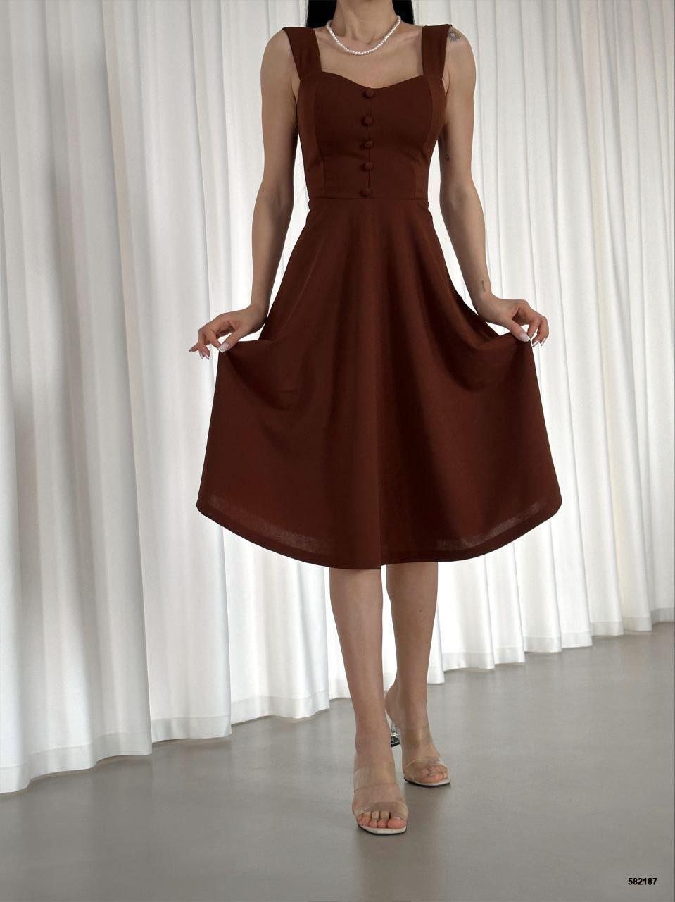Kadın Krep Kumaş Askılı Kalp Yaka Düğme Detay Midi Boy Elbise