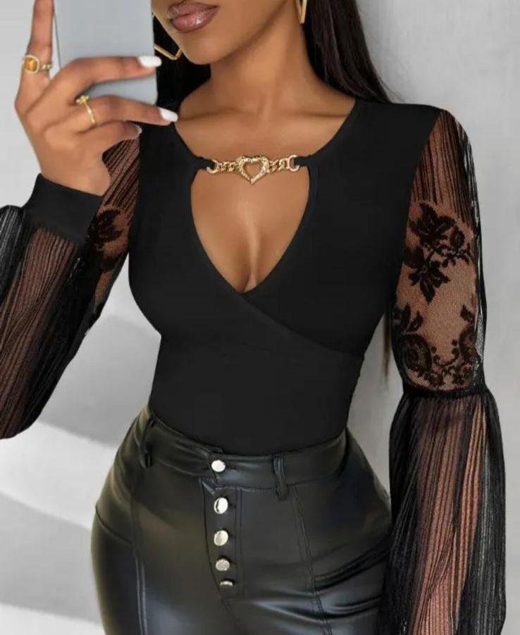 Kadın Kruvaze Yaka Derin Dekolteli Kolları Tül Detay Fırsat ürün Bluz