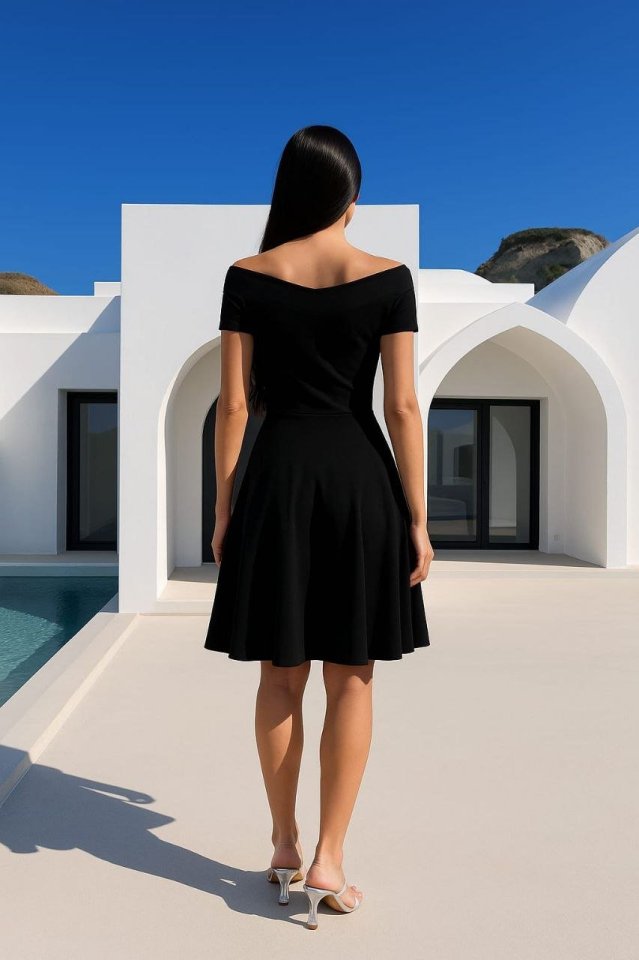 Kadın Madonna Yaka Pliseli Scuba Krep Kumaş Diz üstü Elbise