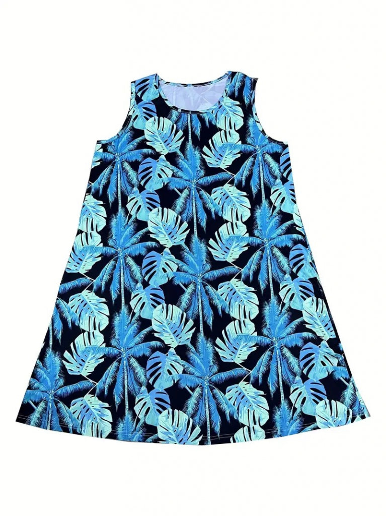 Kadın Mavi Yaprak Baskılı Askılı Süprem Elbise