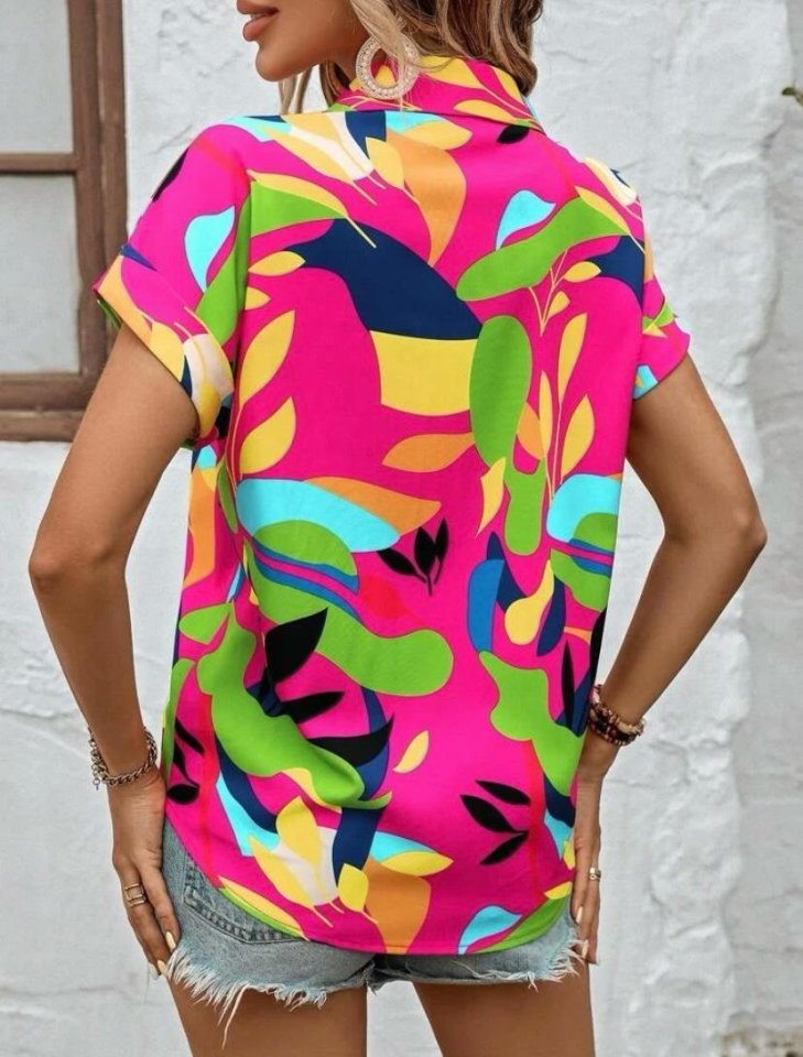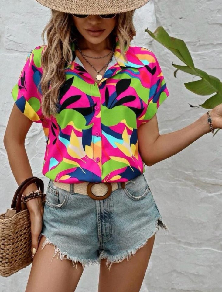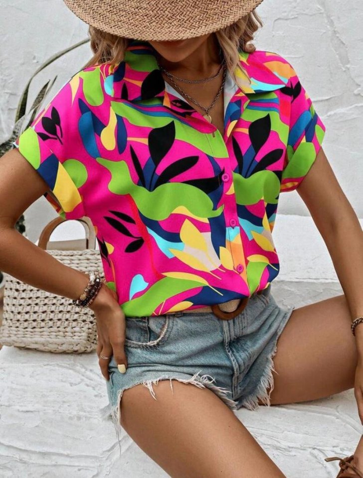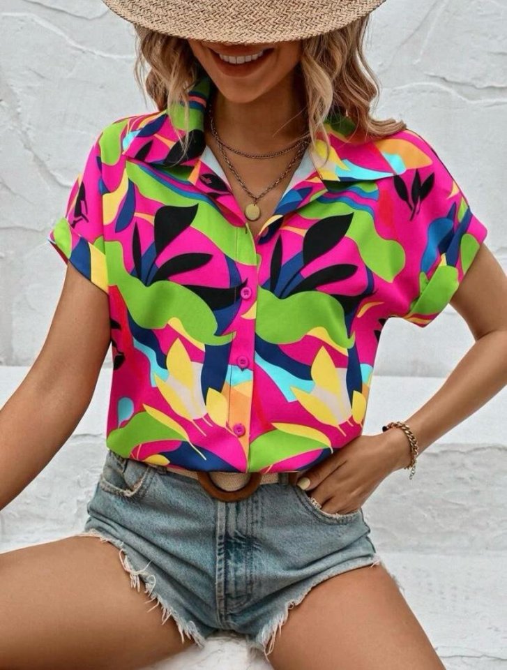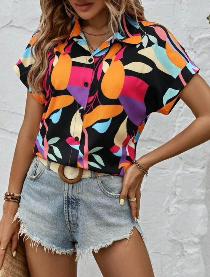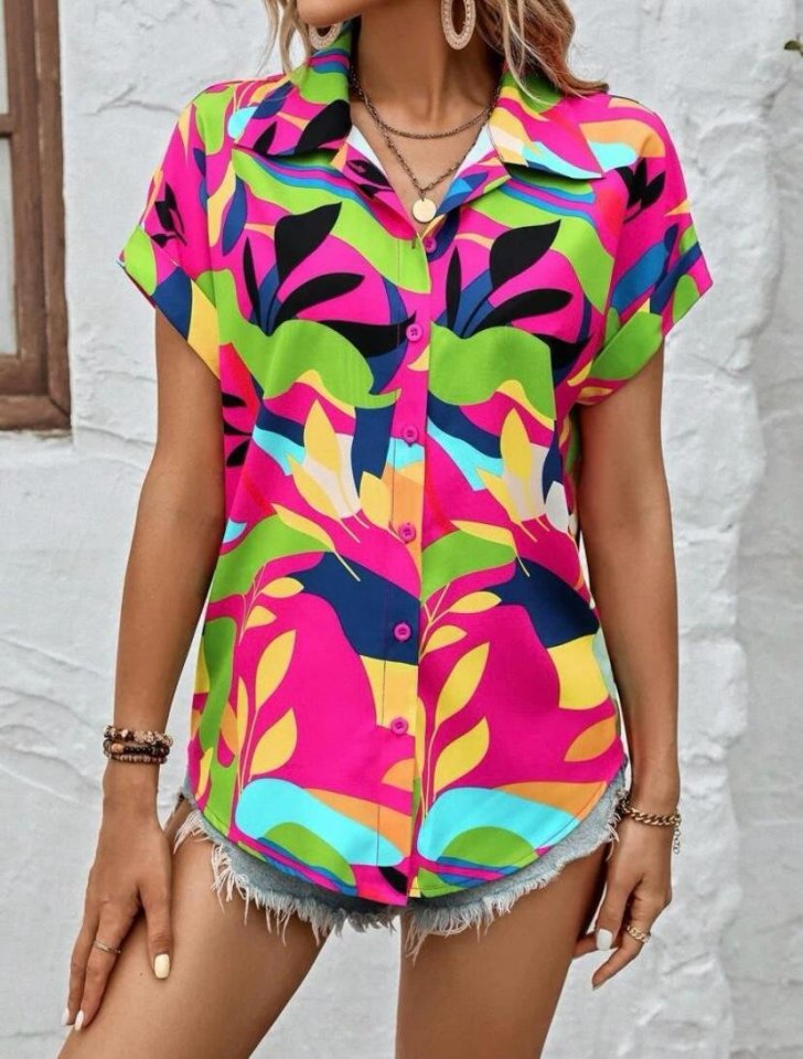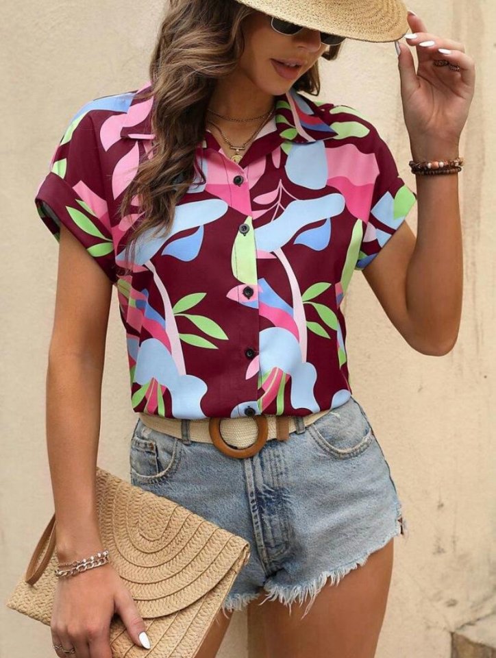 Kadın Moss Krep Kumaş Kısa Kol Çiçek Desenli Gömlek