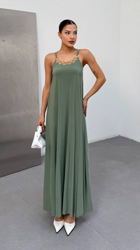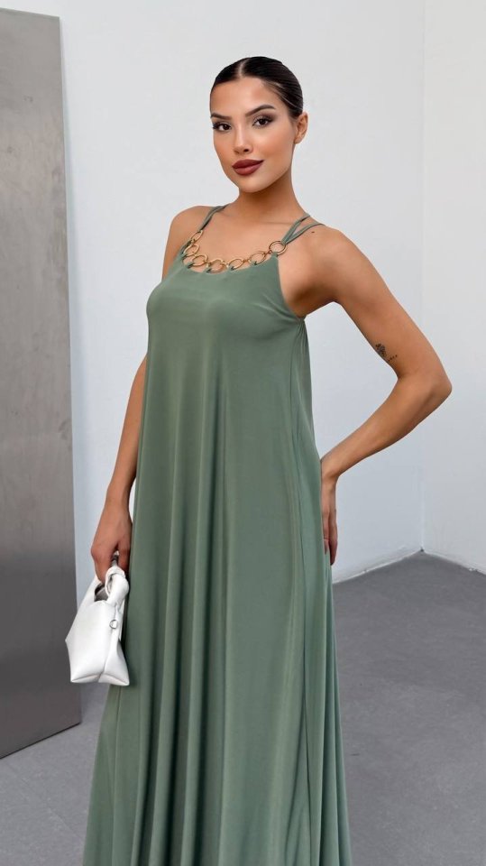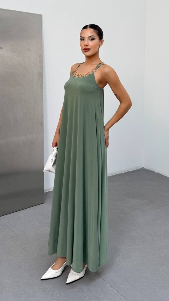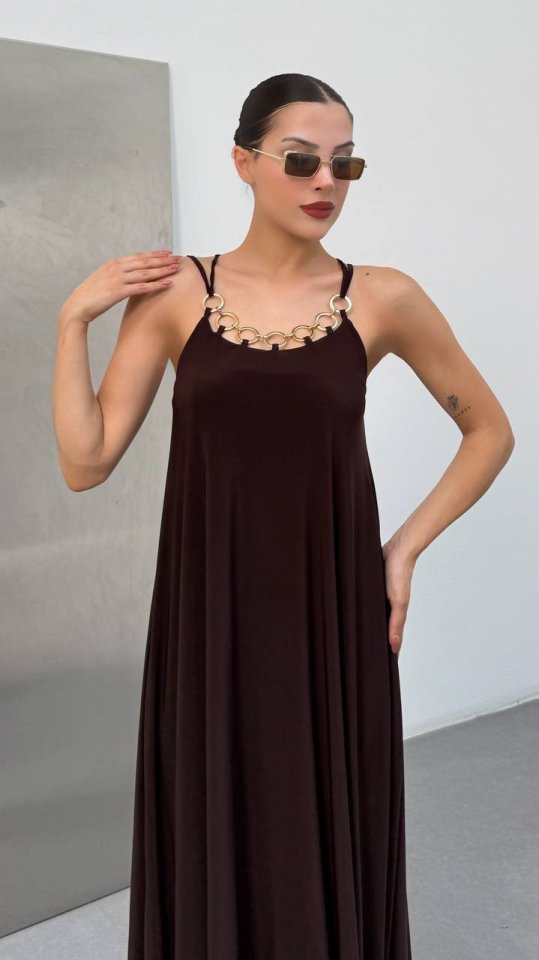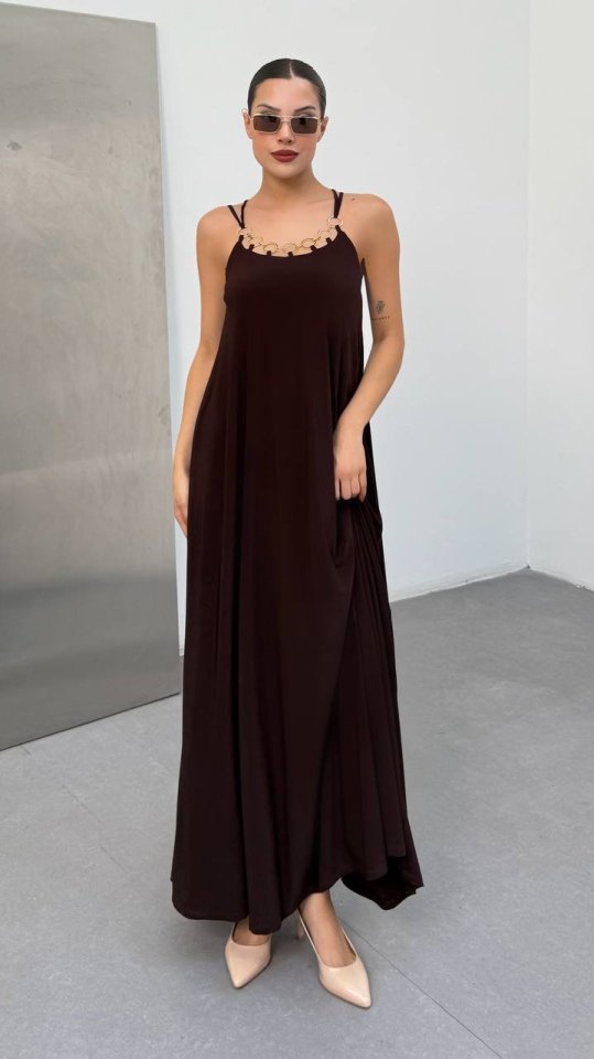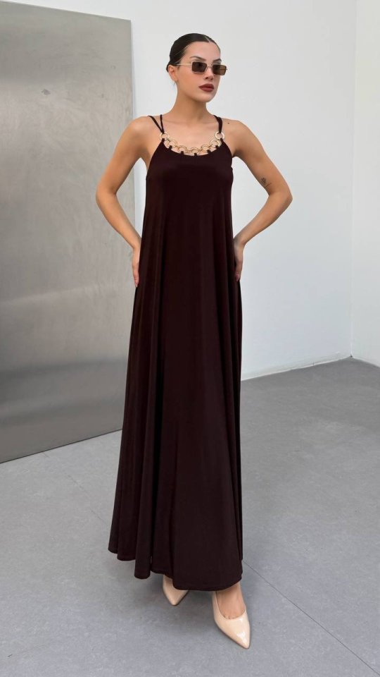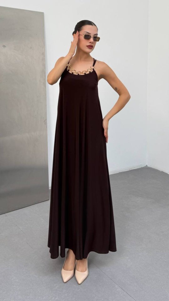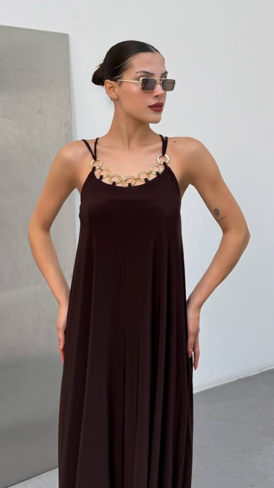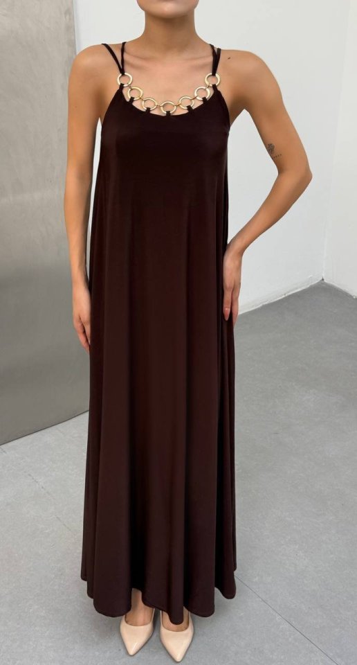 Kadın Omuz Askılı Kuş Gözü Zincir Detay Sandy Kumaş Maxi Boy Elbise