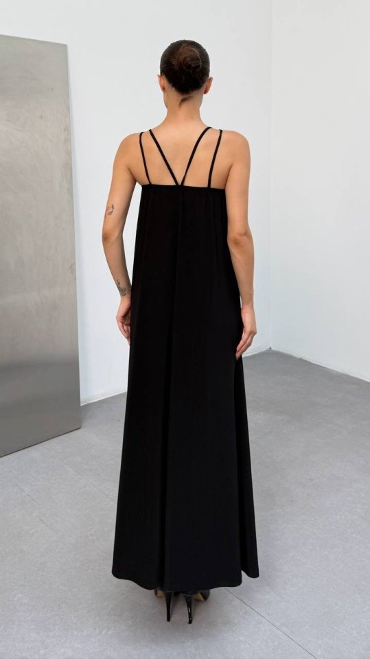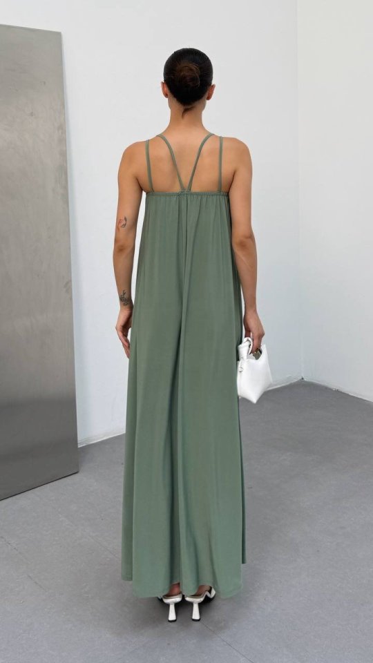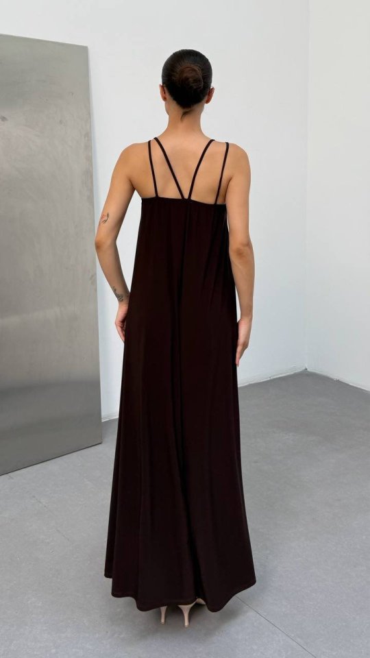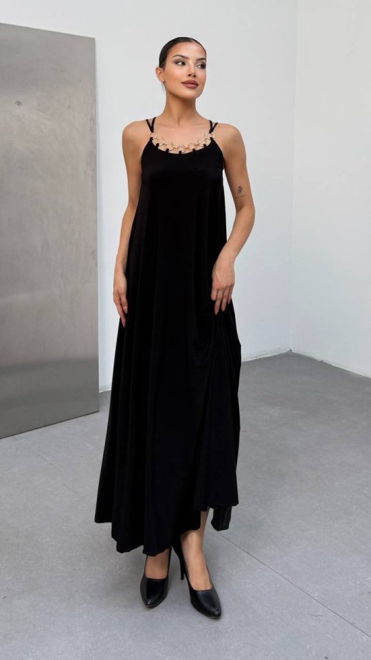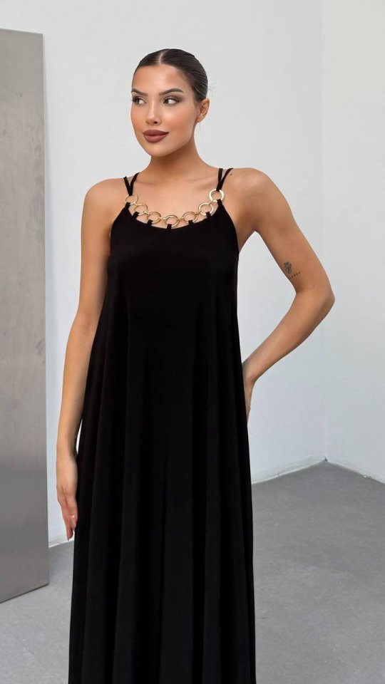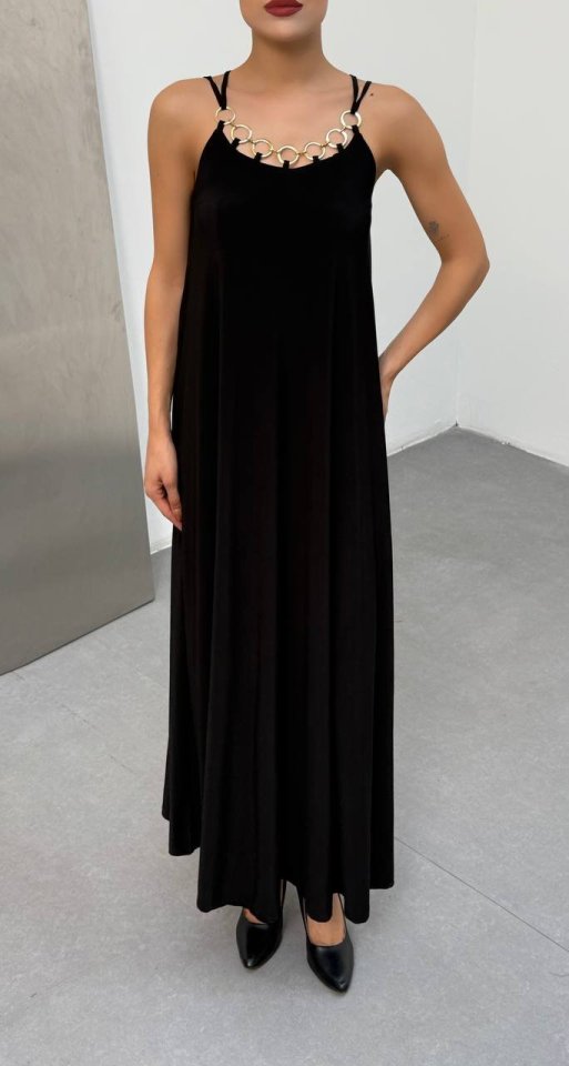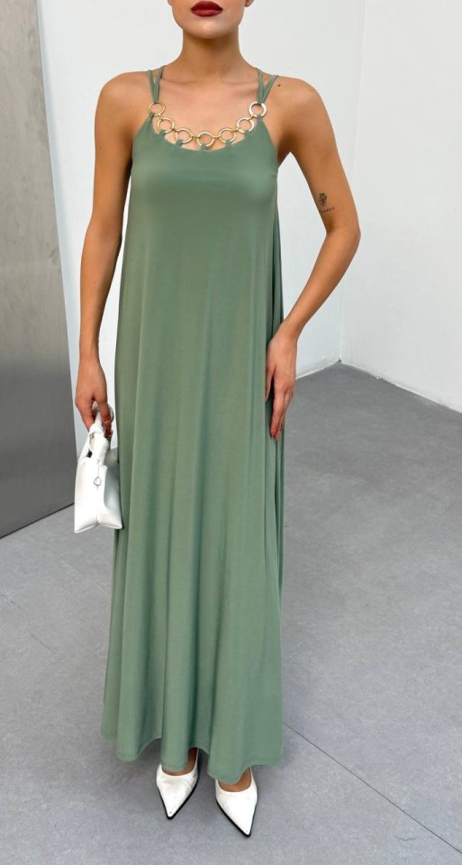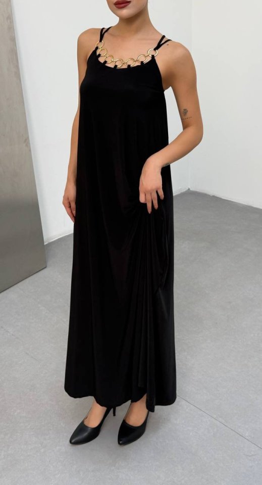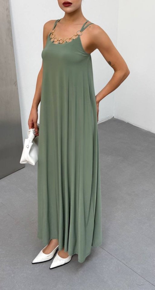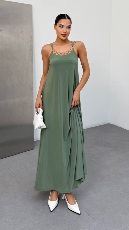 Kadın Omuz Askılı Kuş Gözü Zincir Detay Sandy Kumaş Maxi Boy Elbise