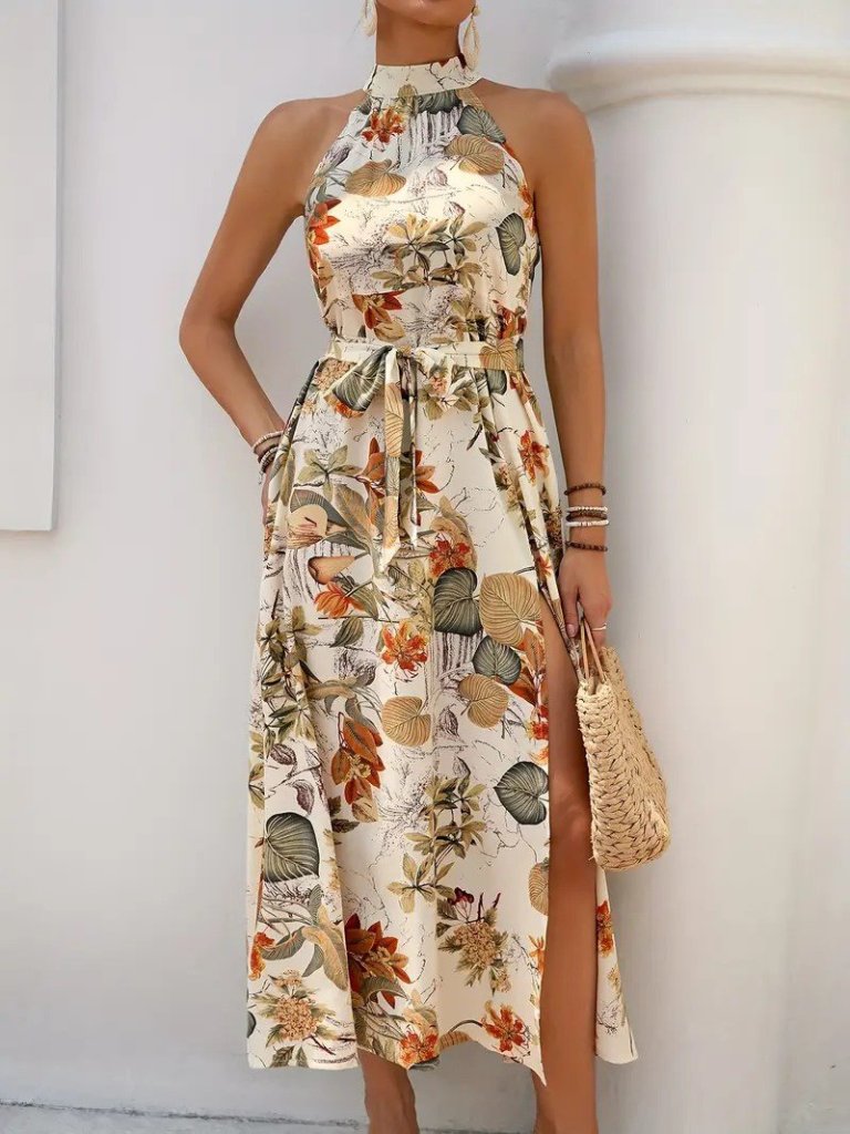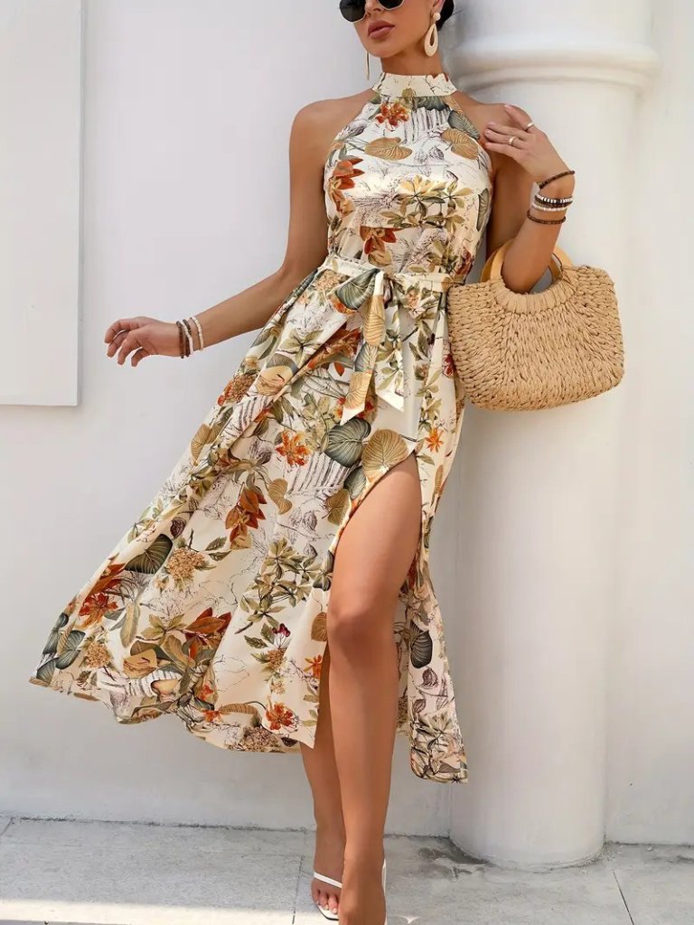 Kadın Omuzlardan Açık Halter Yakalı Yırtmaçlı çiçek Desenli Süprem Elbise